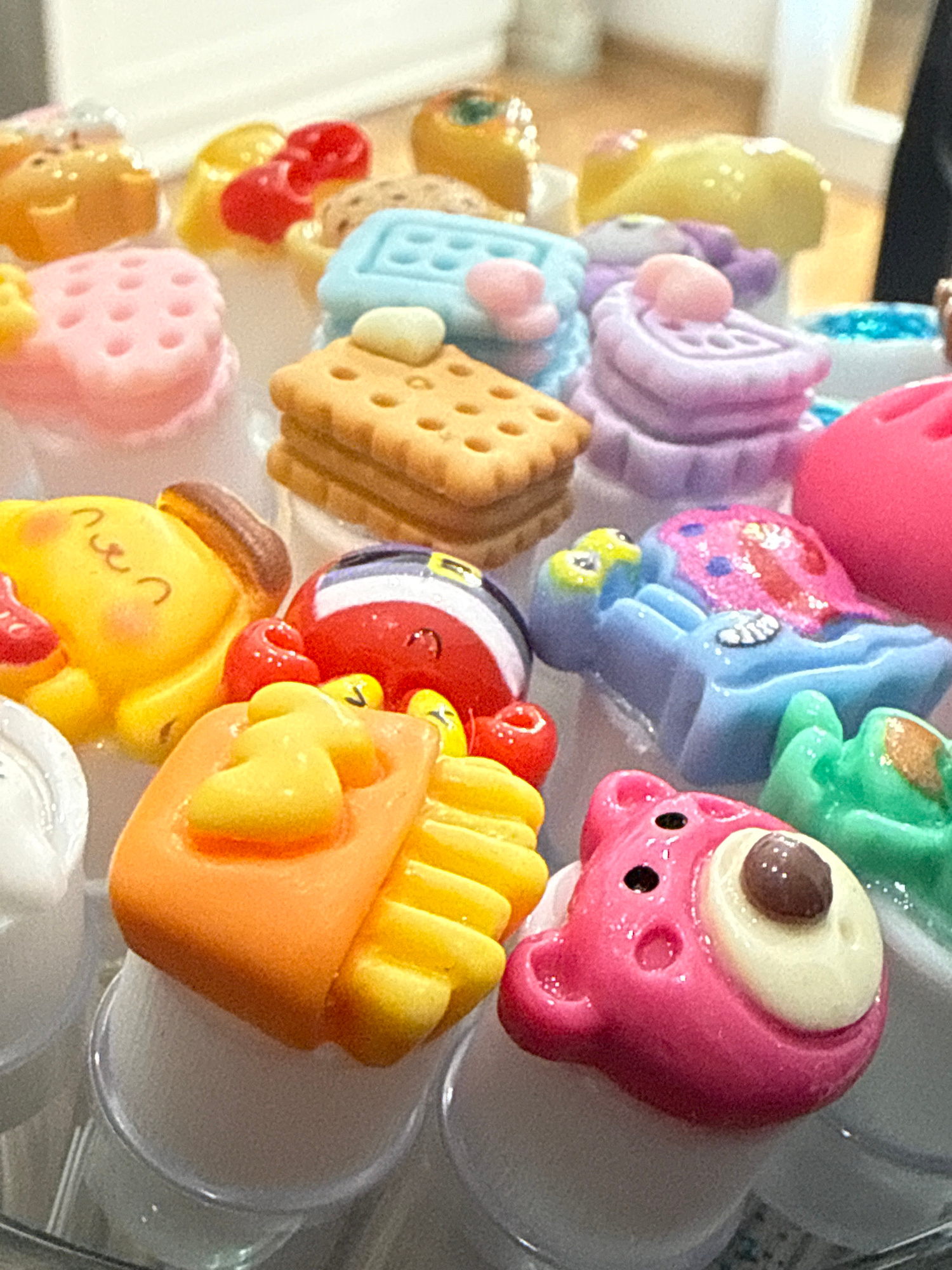 The image presents a close-up view of numerous small, colorful, cartoon-like figurines or charms, tightly arranged together on a display. These items, likely made of plastic or resin, exhibit a mix of…read more
