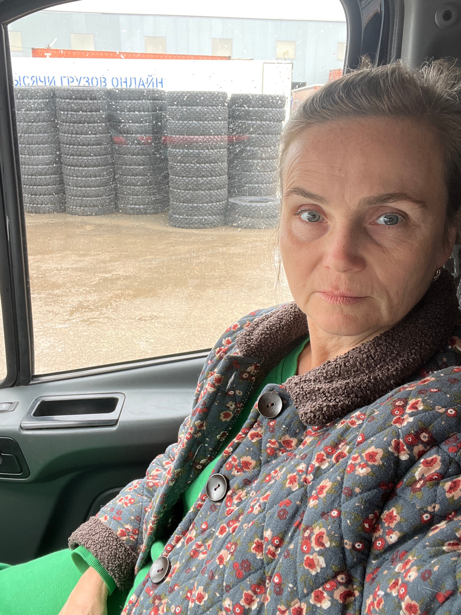A woman is depicted from inside a vehicle, looking directly at the camera. She appears middle-aged with light-colored hair pulled back and light blue or grey eyes, exhibiting a neutral expression. She…read more