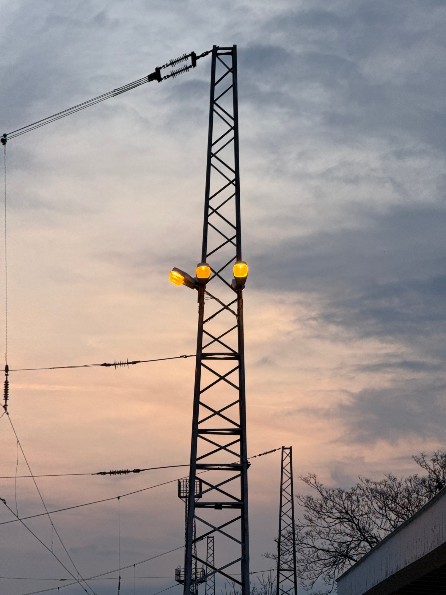 A low-angle shot shows a metal lattice tower with three lights illuminated. The tower is located outdoors. Power lines extend from the tower, with insulators visible along the lines. The sky forms the…read more