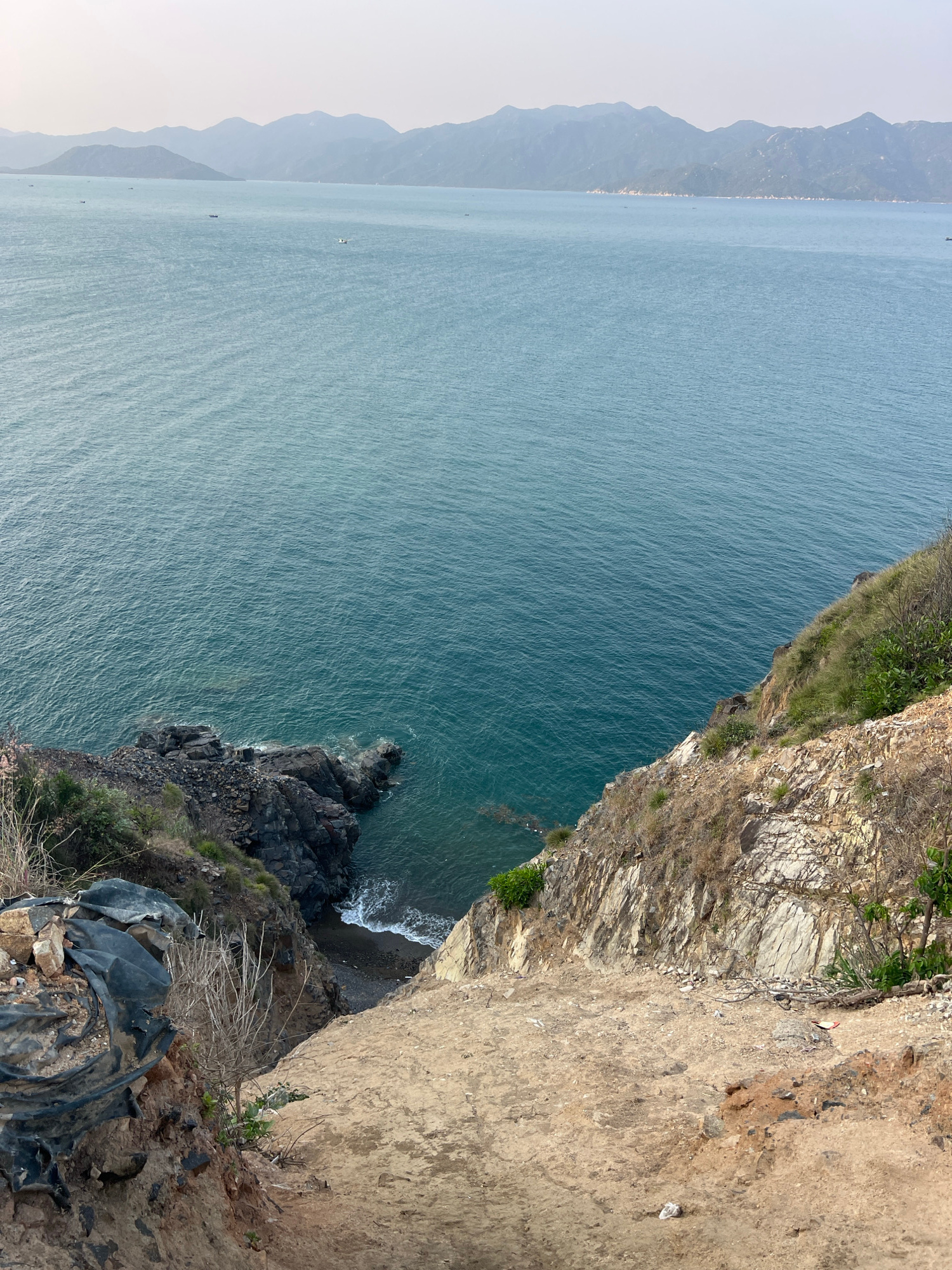 A view from atop a cliff in Bac Natural Heritage Area Trang, Vietnam, showcases a body of water to the left. The cliffside is characterized by stratified rock formations and earthy tones, with sparse…read more