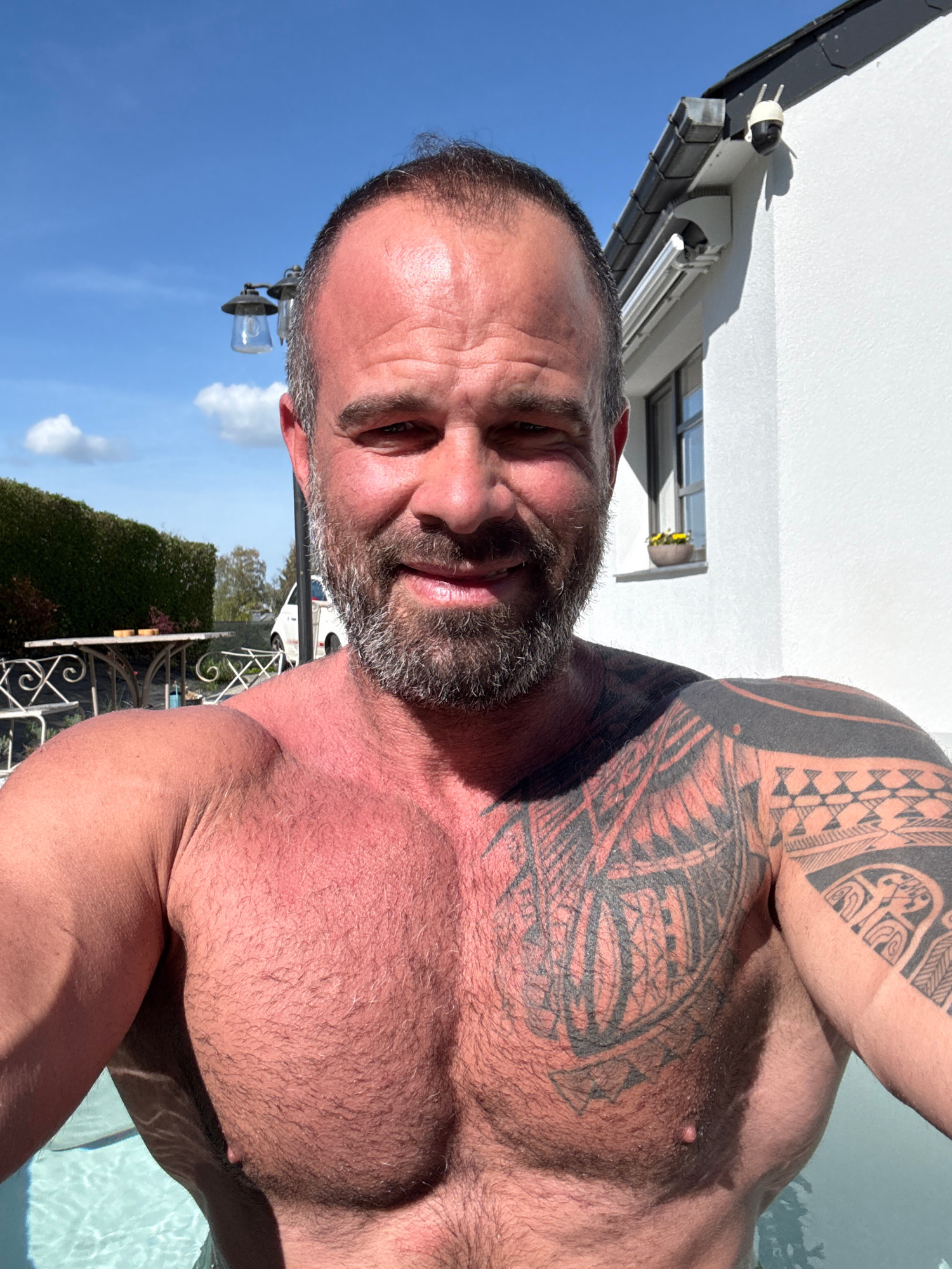 This close-up, rotated portrait captures a muscular man outdoors, likely taking a selfie. He is shirtless, revealing a well-built physique with a broad chest and prominent dark, tribal-style tattoos cā¦read more
