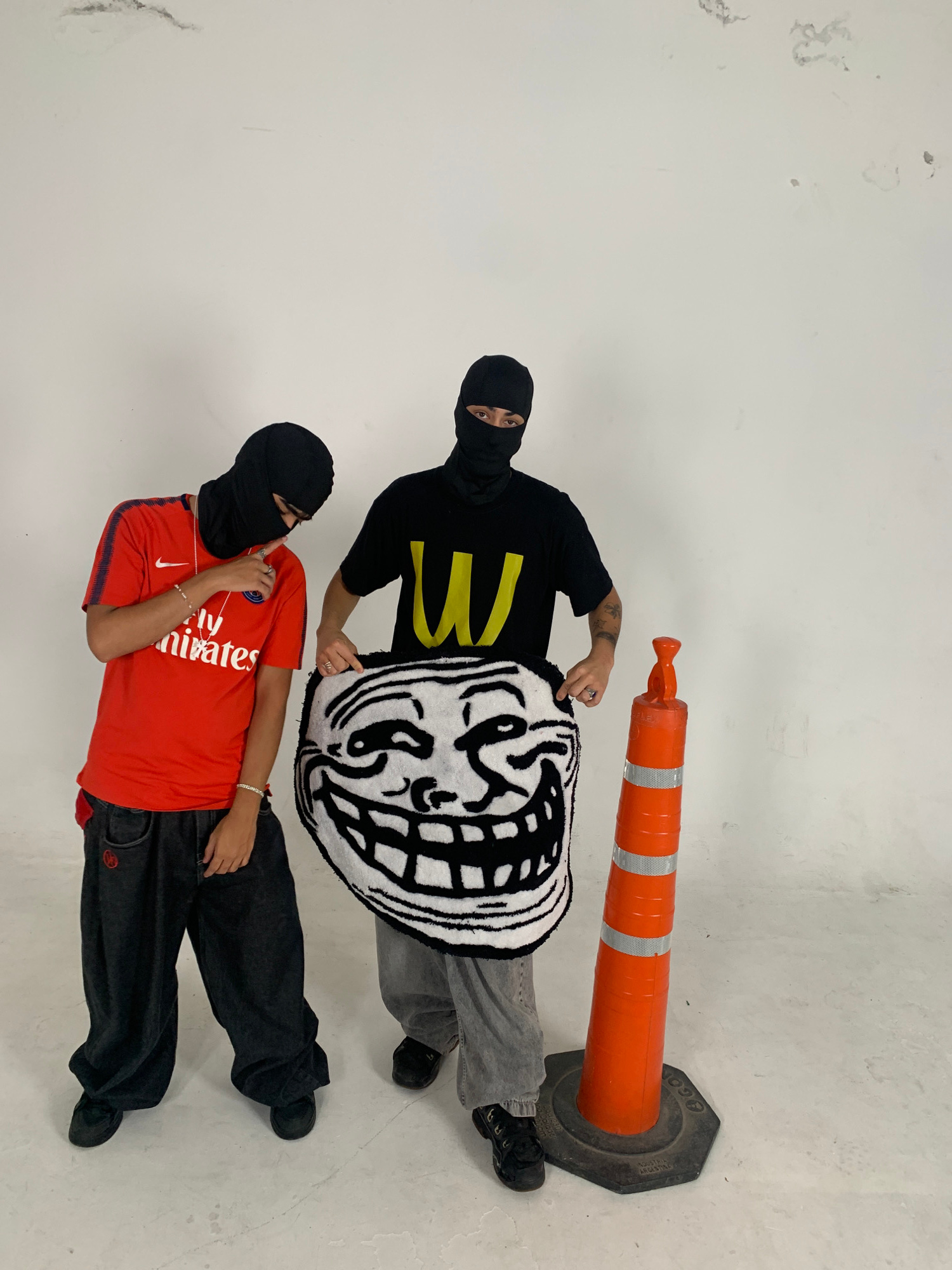 Two individuals wearing balaclavas stand in an indoor space. The individual on top wears a black t-shirt with a yellow McDonald's "M" logo and holds a black and white rug featuring a "Trollface" meme…read more