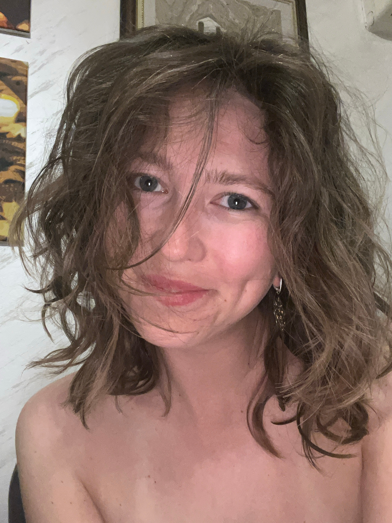 A selfie shot shows a person with shoulder-length, wavy brown hair. Some strands of hair partially obscure the person's face, specifically around the forehead and left eye. The person has light skin a…read more