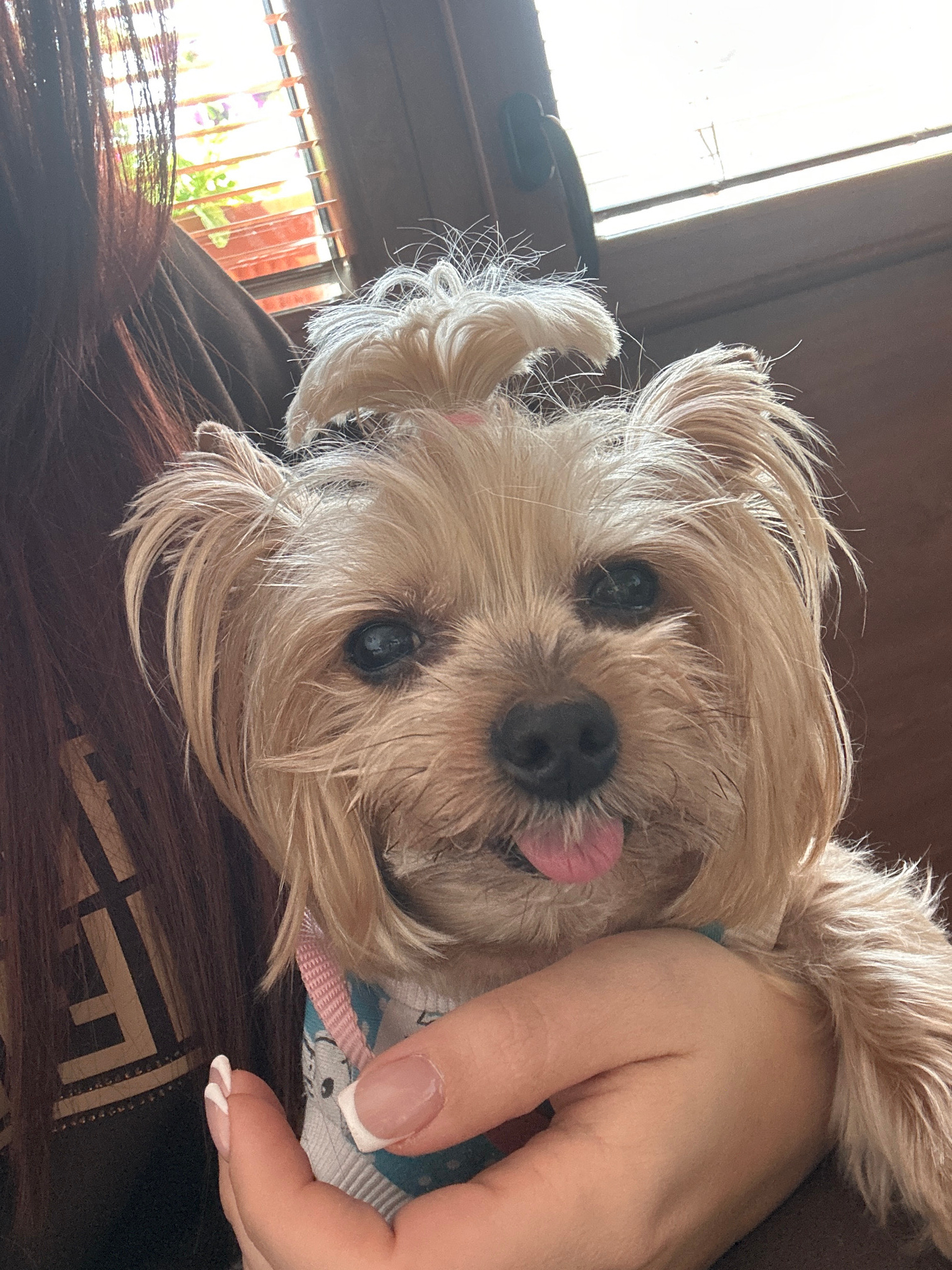 The image shows a small, light-colored dog with long hair, possibly a Yorkshire Terrier or similar breed, sticking its tongue out. The dog is being held by a person whose hand is visible in the frame,…read more