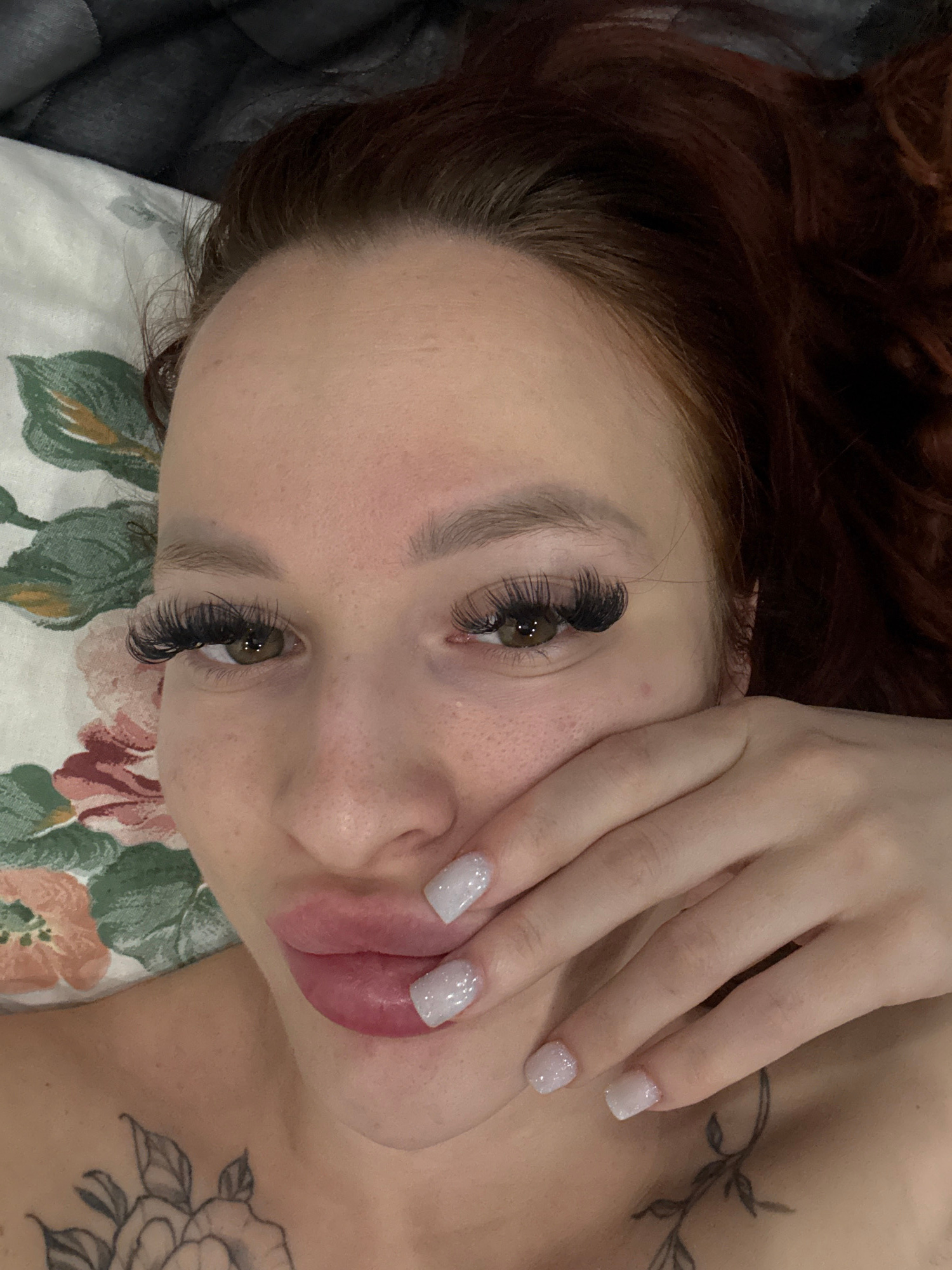 A woman with auburn hair and false eyelashes is lying down, partially obscuring her face with her right hand. She has fair skin, and her nails are painted white with glitter. A floral tattoo is visibl…read more