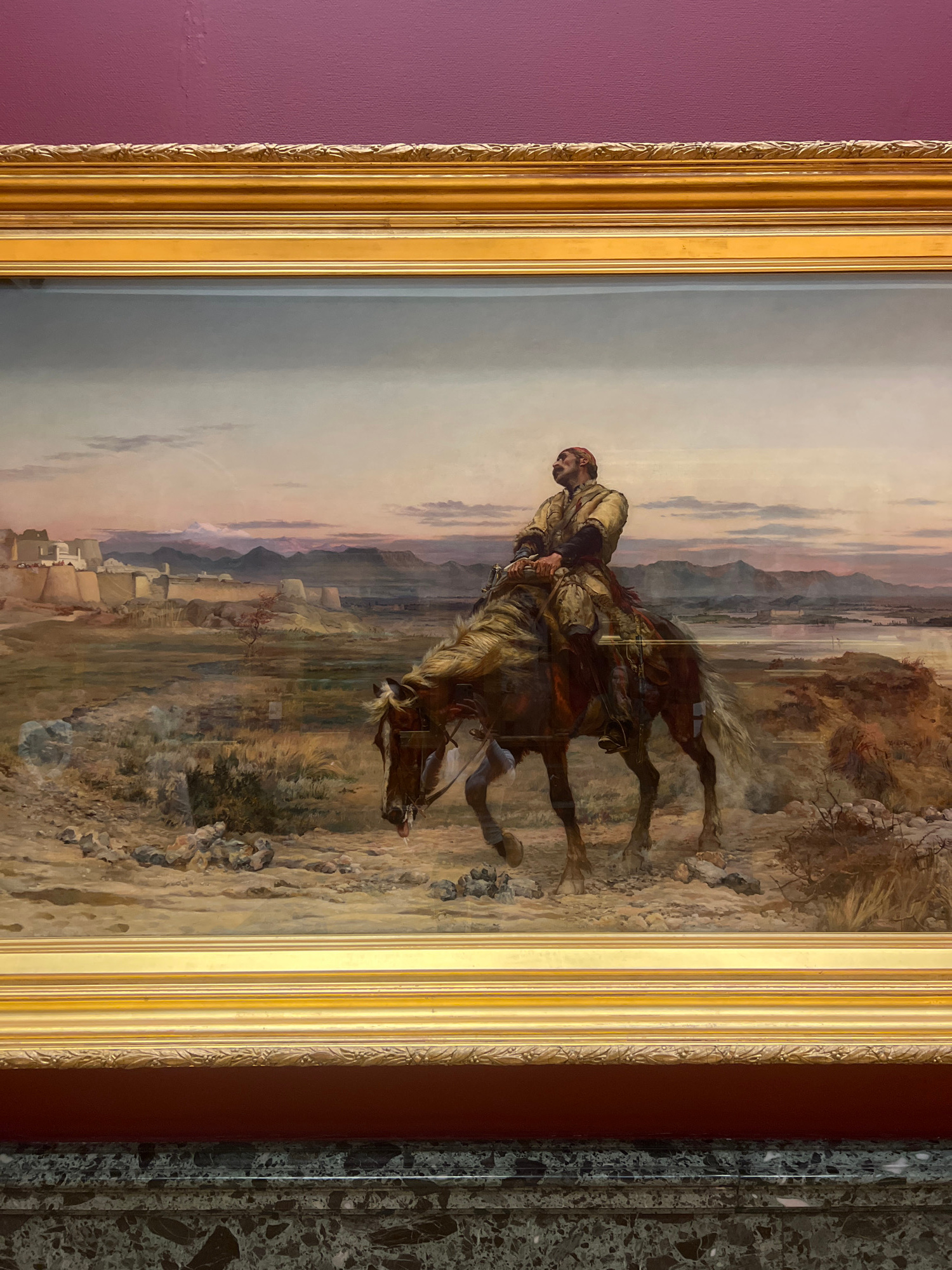 The image displays a vertical painting depicting a solitary man riding a horse through an expansive, arid landscape. The man, positioned in the center-left, is seen in profile, facing right. He wears…read more