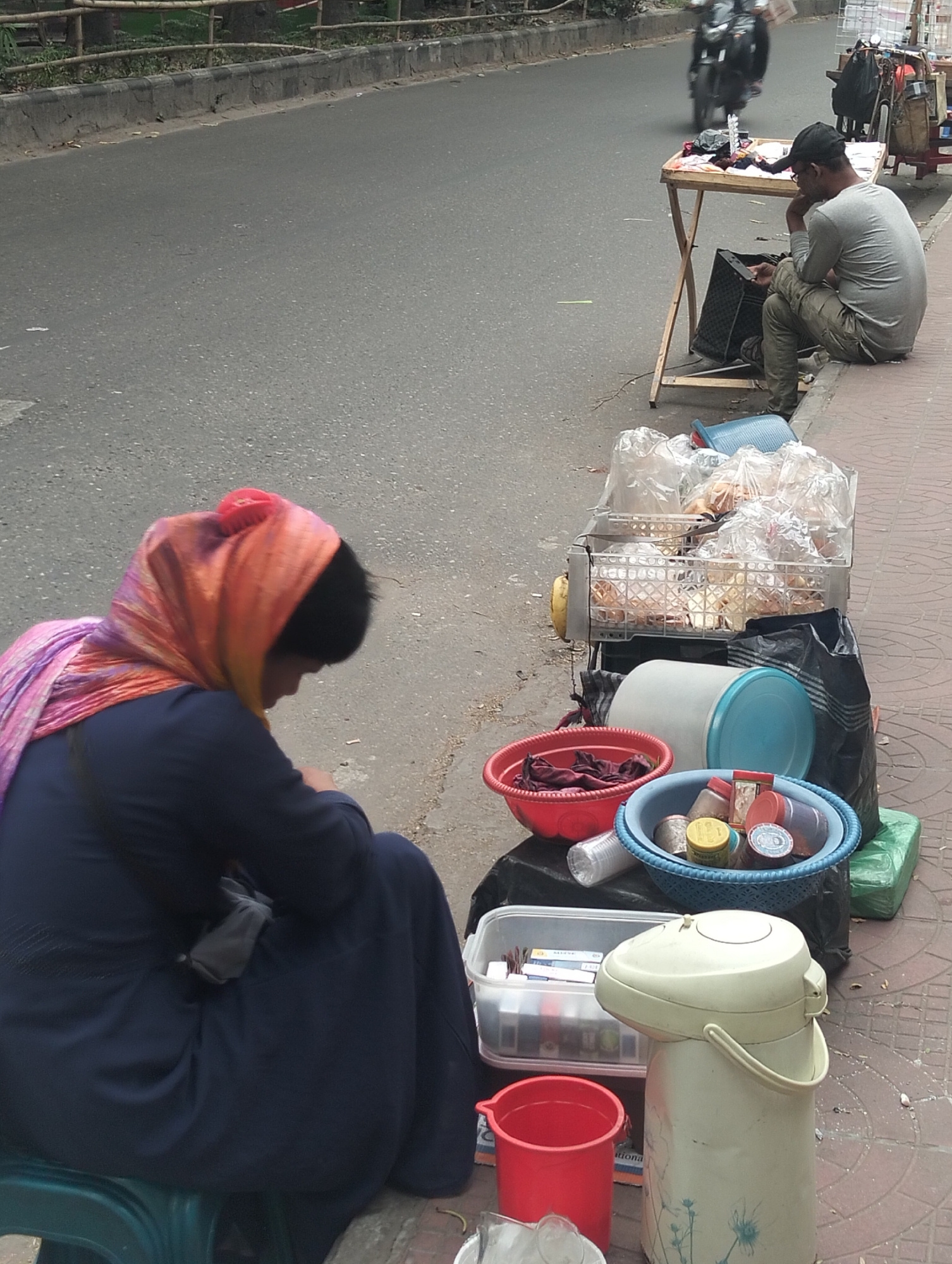In Dhaka, Bangladesh, a woman with an orange and purple headscarf sits on a green plastic stool next to a variety of goods laid out for sale on the sidewalk. These include bagged foods in a wire baske…read more