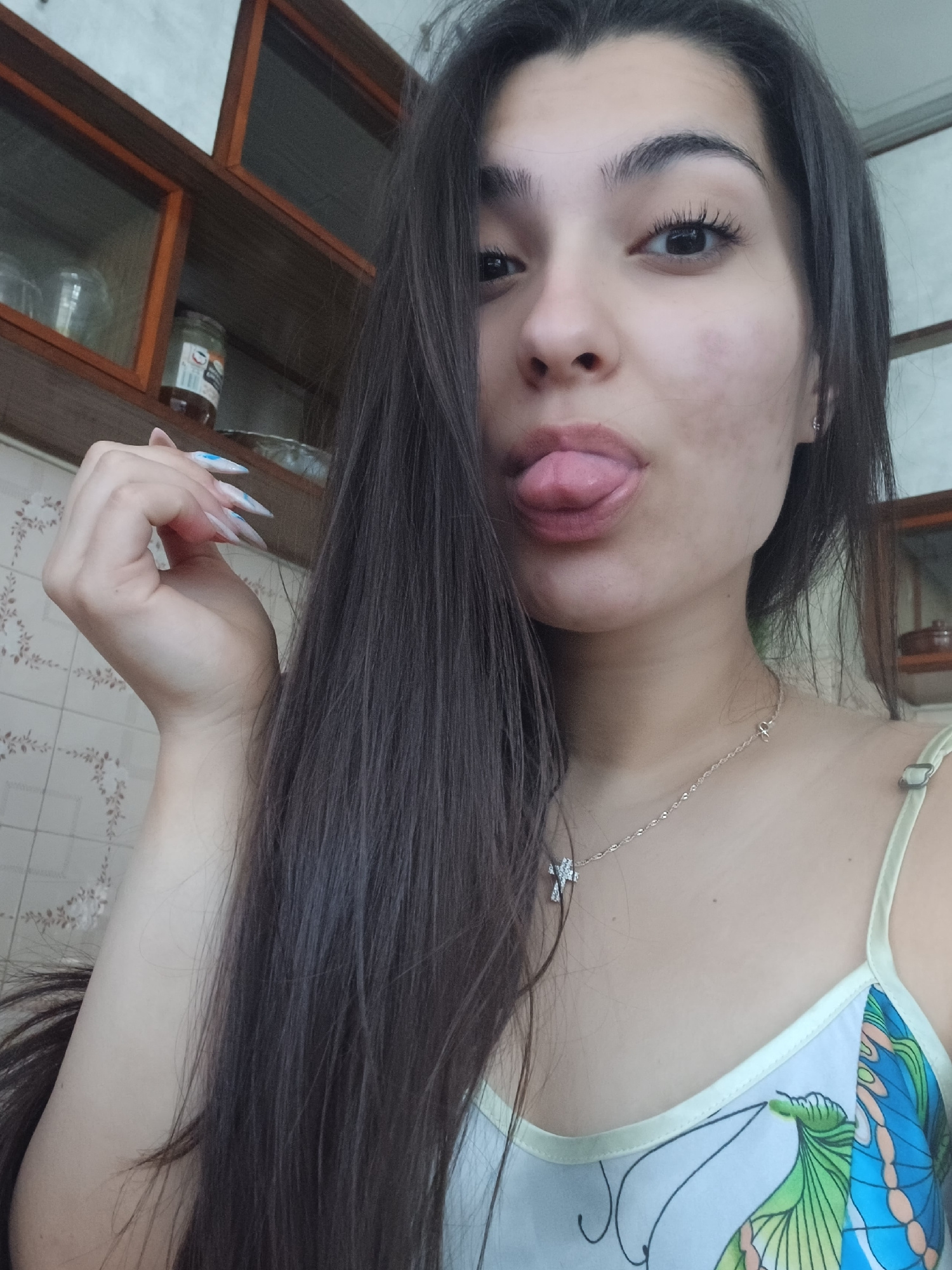A young woman is photographed from an overhead perspective, with her head angled. She has dark hair and fair skin, and she is sticking her tongue out. She is wearing a necklace and a patterned top. He…read more
