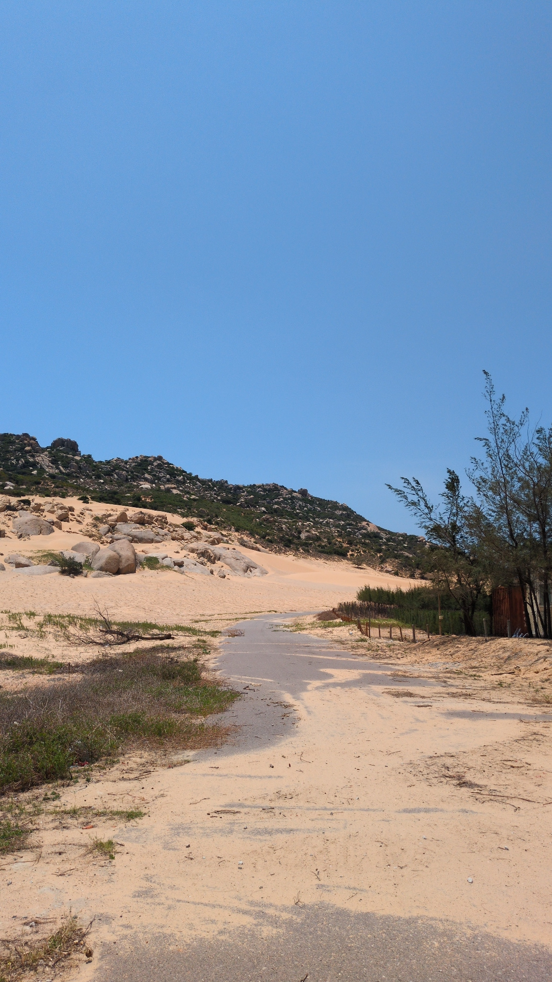 The image shows a landscape in Phuoc Dinh, Vietnam. The scene includes a sandy hill covered with rocks and some vegetation. A dirt road runs alongside the hill, transitioning into a paved surface on t…read more