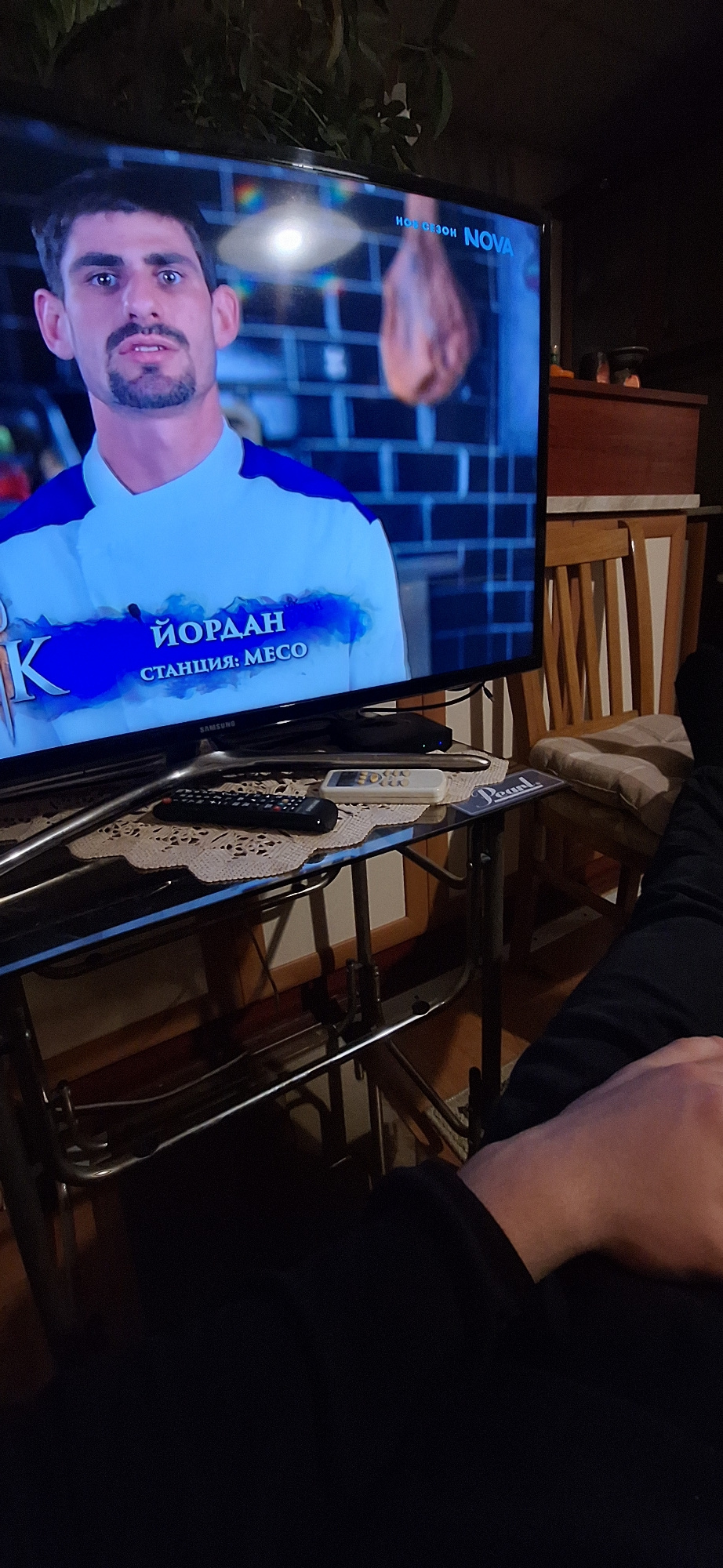 The image shows a television screen displaying an episode of what appears to be a cooking competition show. A man's face is visible on the screen along with text in Cyrillic characters, including "ЙОР…read more