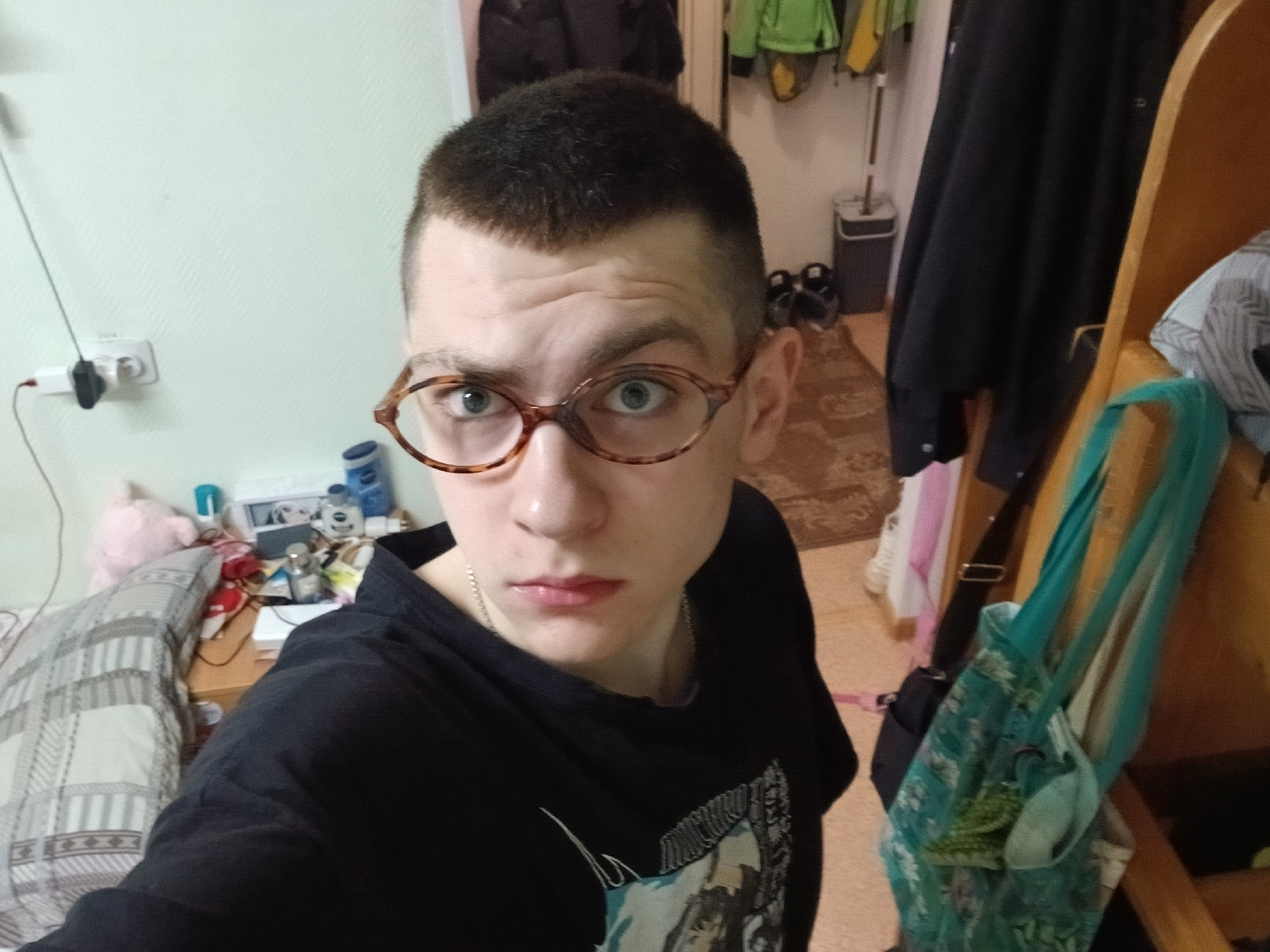 A medium, eye-level shot shows a young man wearing tortoise-shell glasses and a black t-shirt with a graphic on the front. He is looking directly at the camera. He has a short, dark buzz cut. A thin s…read more