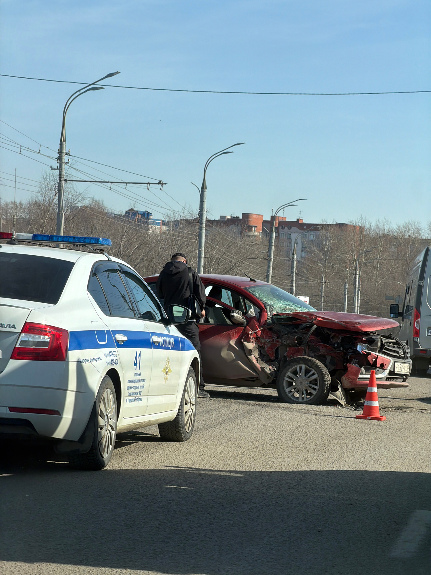 A traffic accident scene in Izhevsk, Russia. A heavily damaged red car is near the curb, its front end significantly crushed and the windshield shattered. An orange traffic cone sits atop the damaged…read more