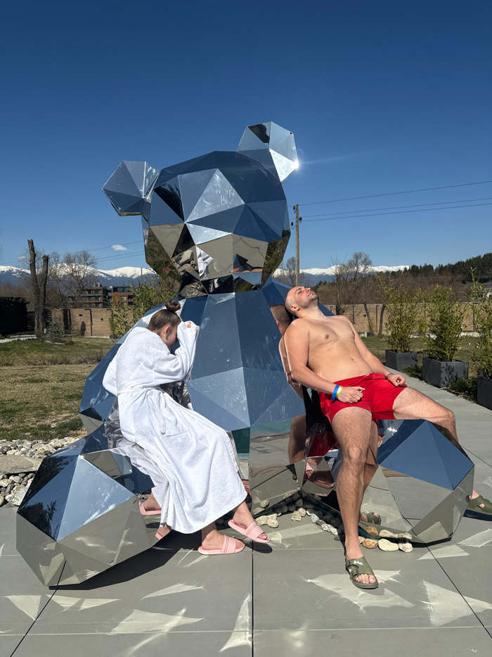 The image depicts an outdoor scene in Bania, Bulgaria, featuring two individuals positioned around a large, faceted, chrome-plated bear sculpture under a clear blue sky. On the left, a female subject…read more