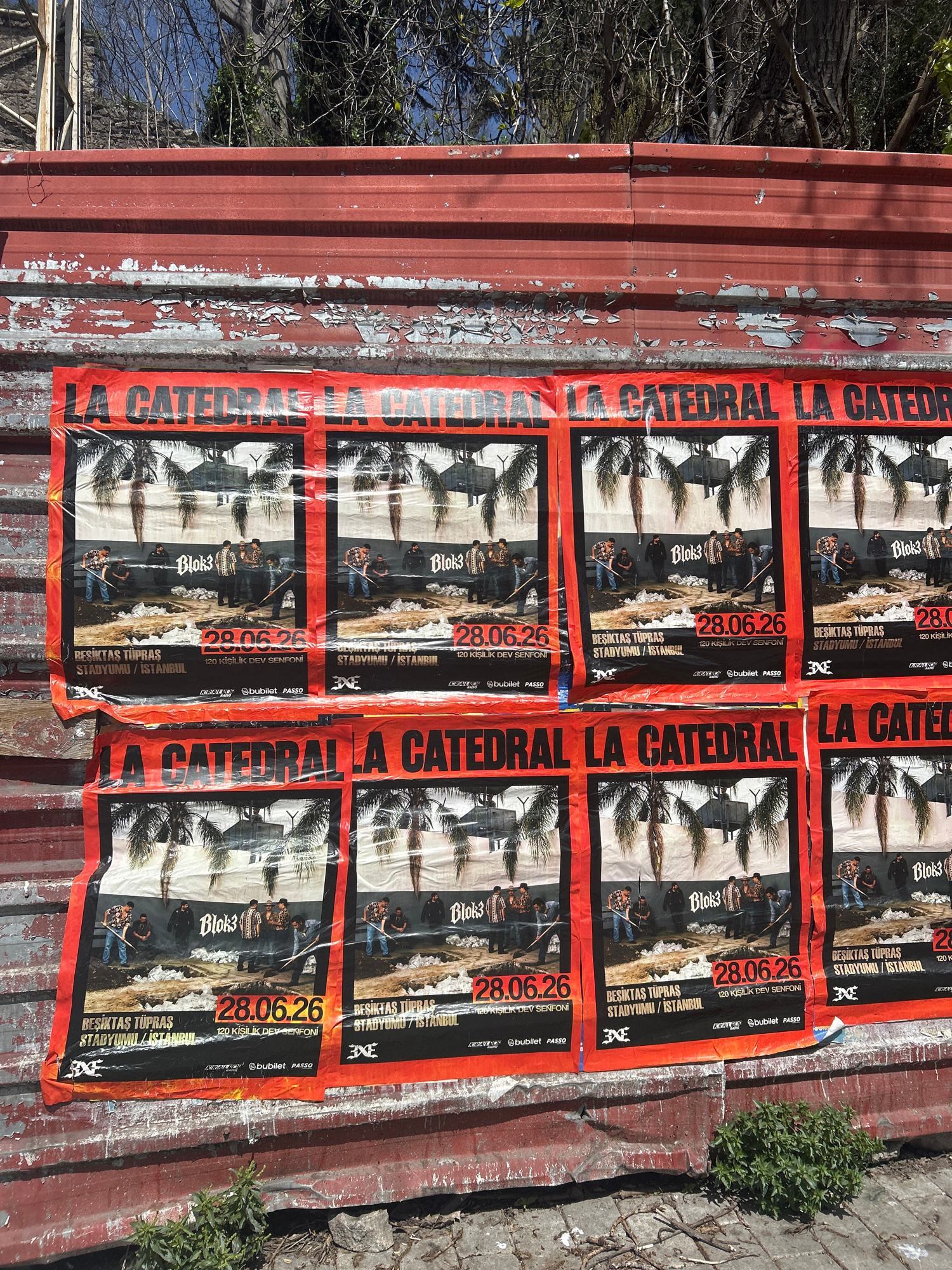 The image shows a series of posters adhered to a corrugated metal surface, likely a wall or roof. The posters are printed with an advertisement for an event called "LA CATEDRAL" featuring "Blok3" on J…read more