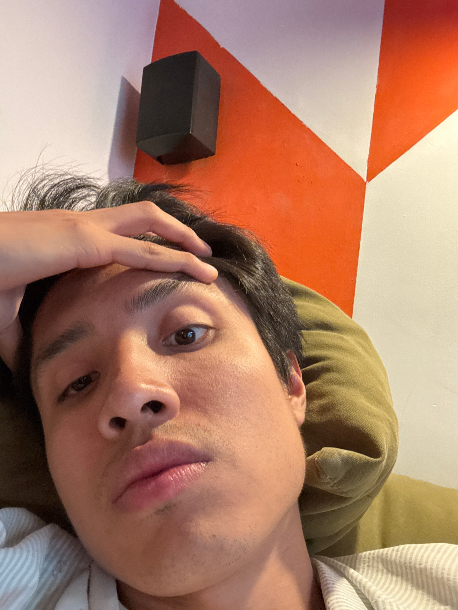 A close-up, rotated portrait captures a person, likely male, lying down indoors. The individual has dark hair and brown eyes, looking directly towards the viewer with a neutral to slightly pensive exp…read more