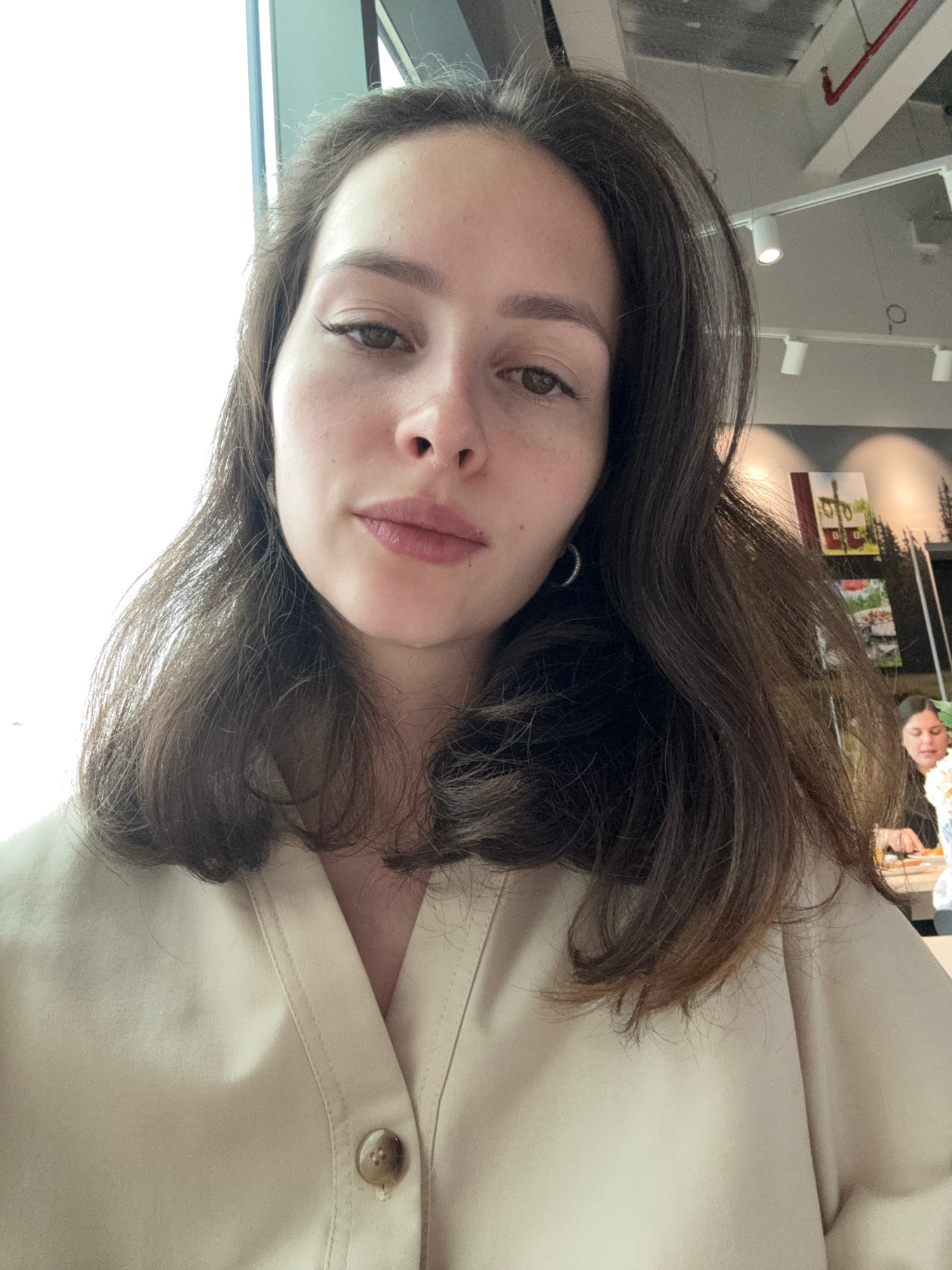The image depicts a woman with brown hair and fair skin, likely in her late teens or early twenties. She is wearing a light beige shirt or jacket with a button visible. The background suggests an inte…read more