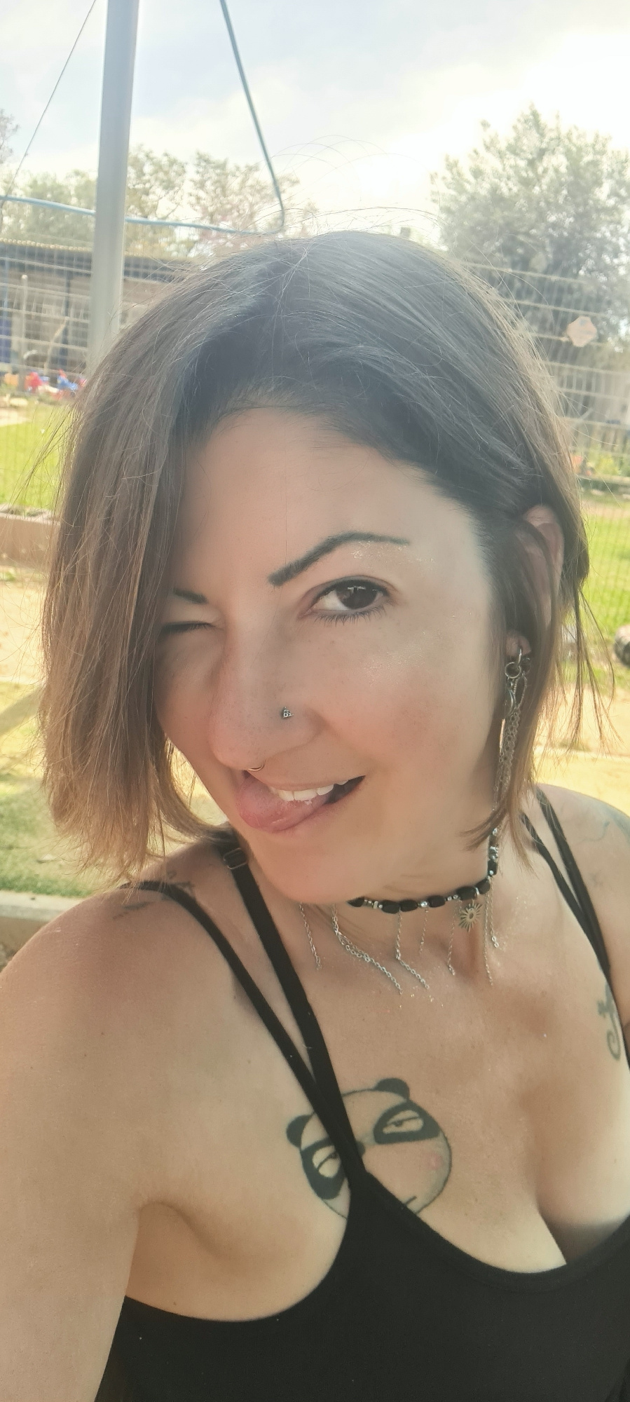 A woman with shoulder-length brown hair, a nose piercing, and tattoos is angled to the left and facing the viewer. She winks, and her tongue is visible. She wears a black top with straps and a necklac…read more