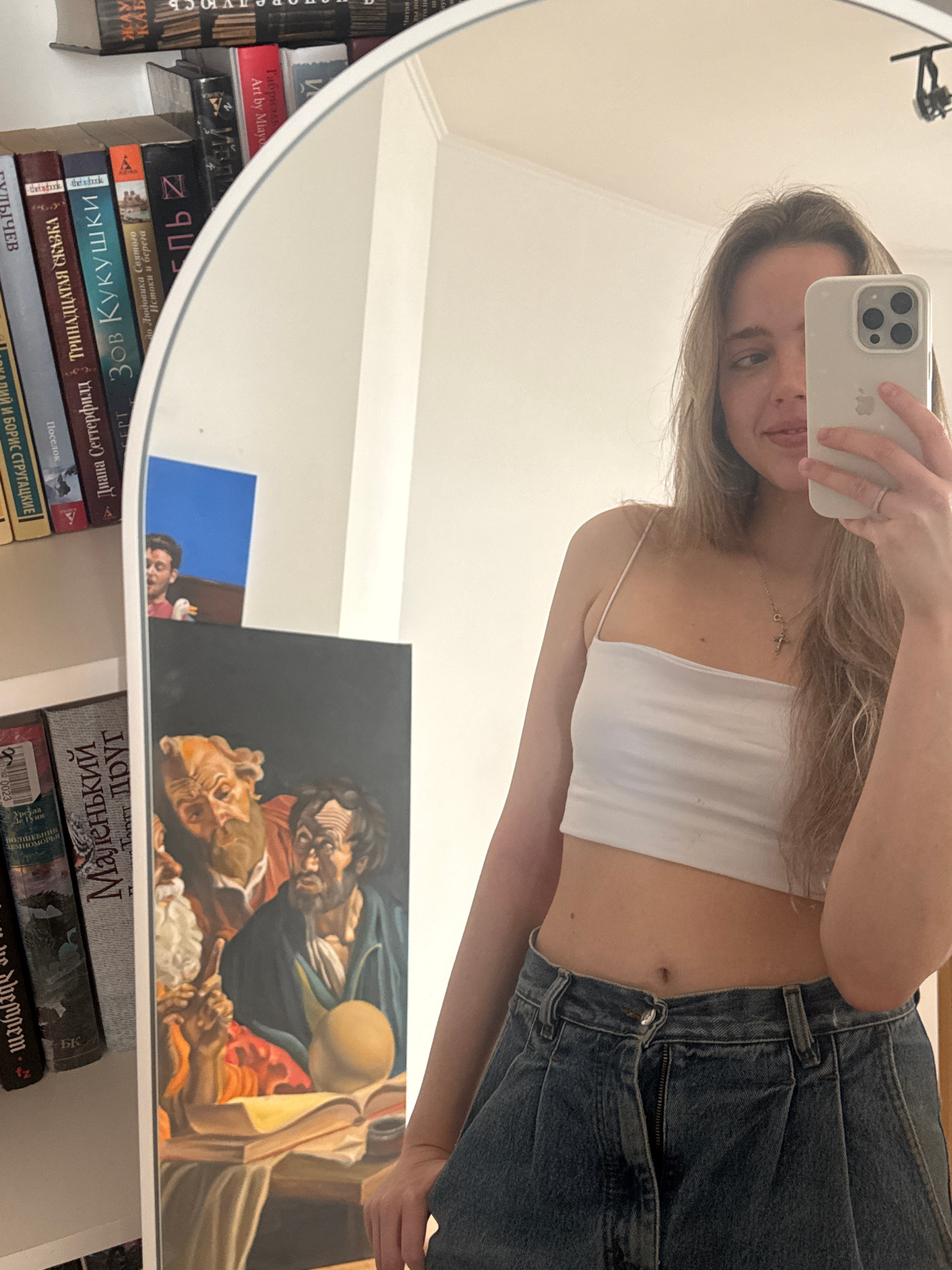 The image is a selfie taken in a mirror. A young woman with long blonde hair is holding an iPhone to capture the reflection. She is wearing a white crop top and blue jeans. Her midriff is visible. The…read more