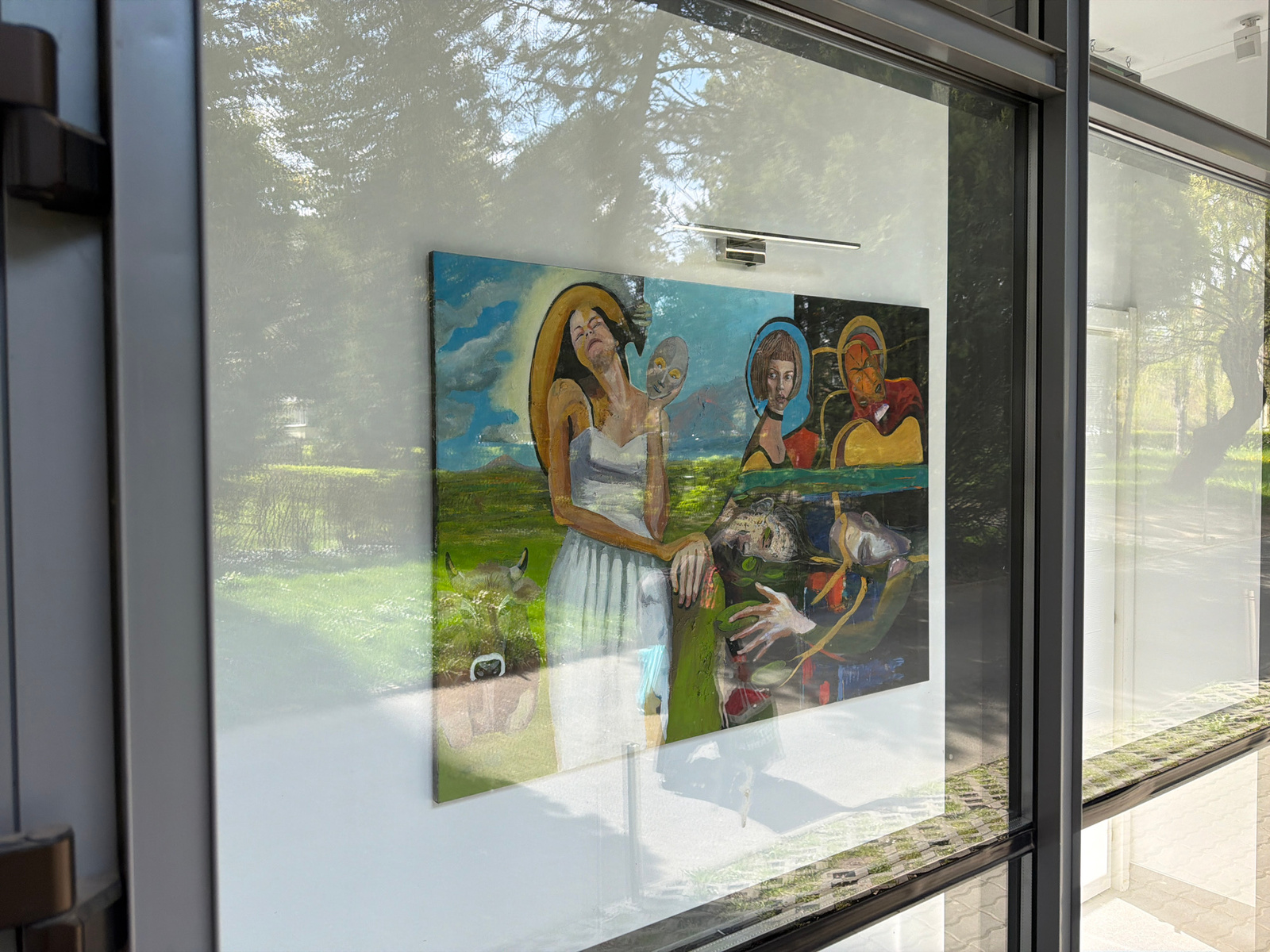 The image captures an oil painting displayed inside a building in Târgu Mureș, Romania. The painting features a female figure with a straw hat in the foreground, partially obscuring an image of two wo…read more