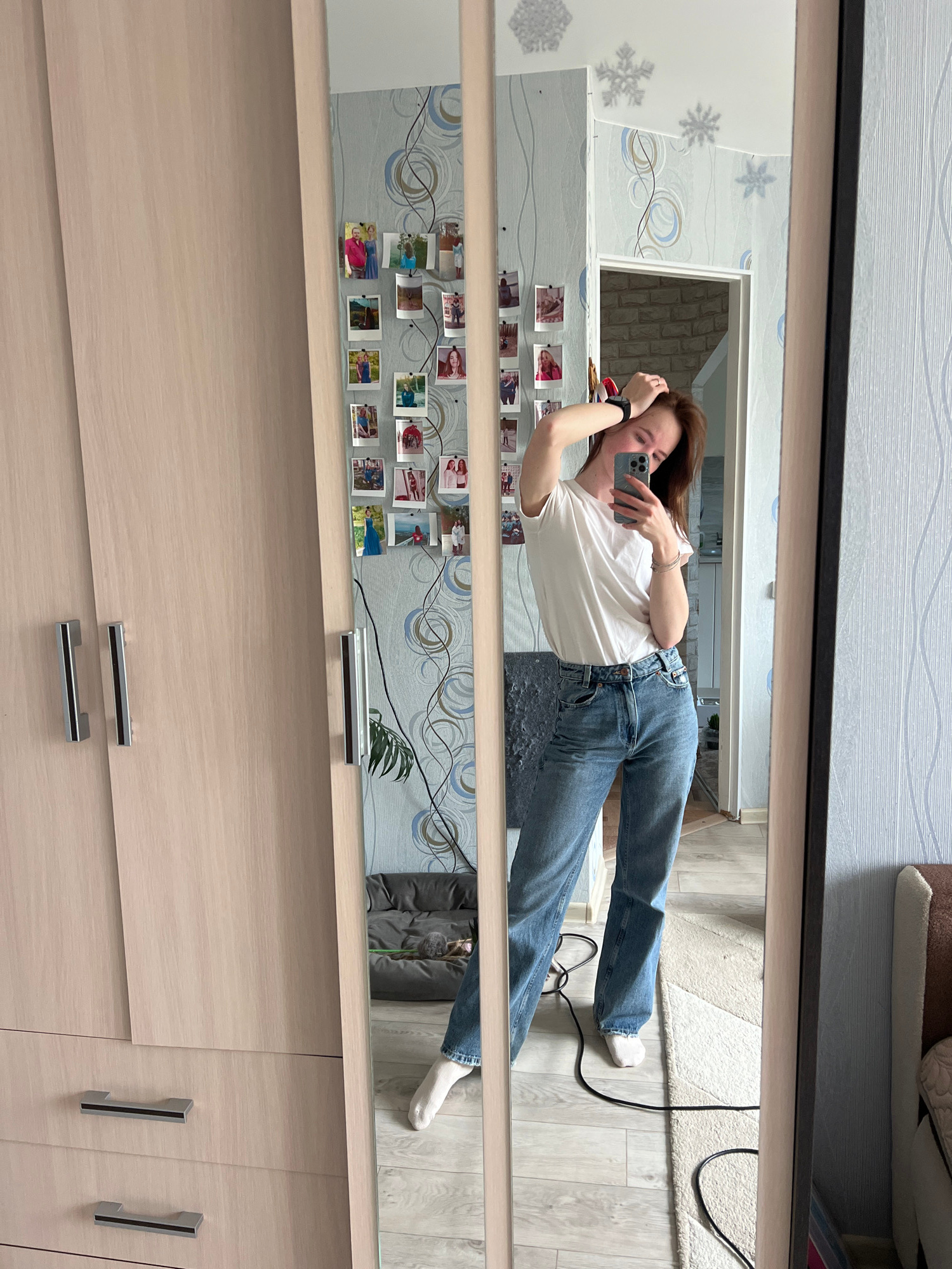 A young woman is captured in a mirror selfie, standing or leaning in an indoor setting. She has long, dark hair, and is wearing a white t-shirt, blue jeans, and white socks. She holds a gray smartphon…read more