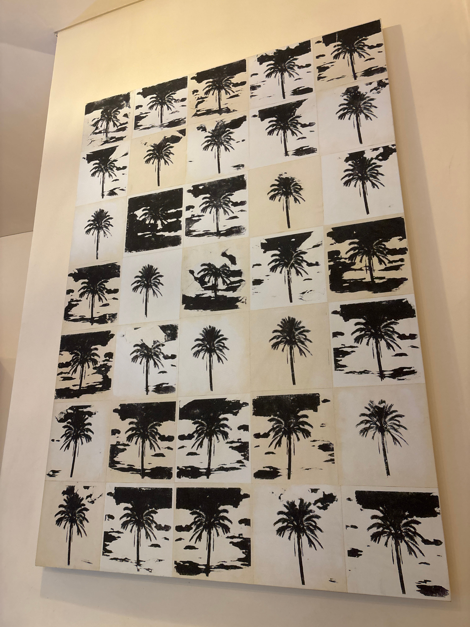 A large, multi-panel artwork featuring stylized palm tree prints is prominently displayed on a light-colored wall in an interior setting. The artwork is composed of numerous square or rectangular tile…read more