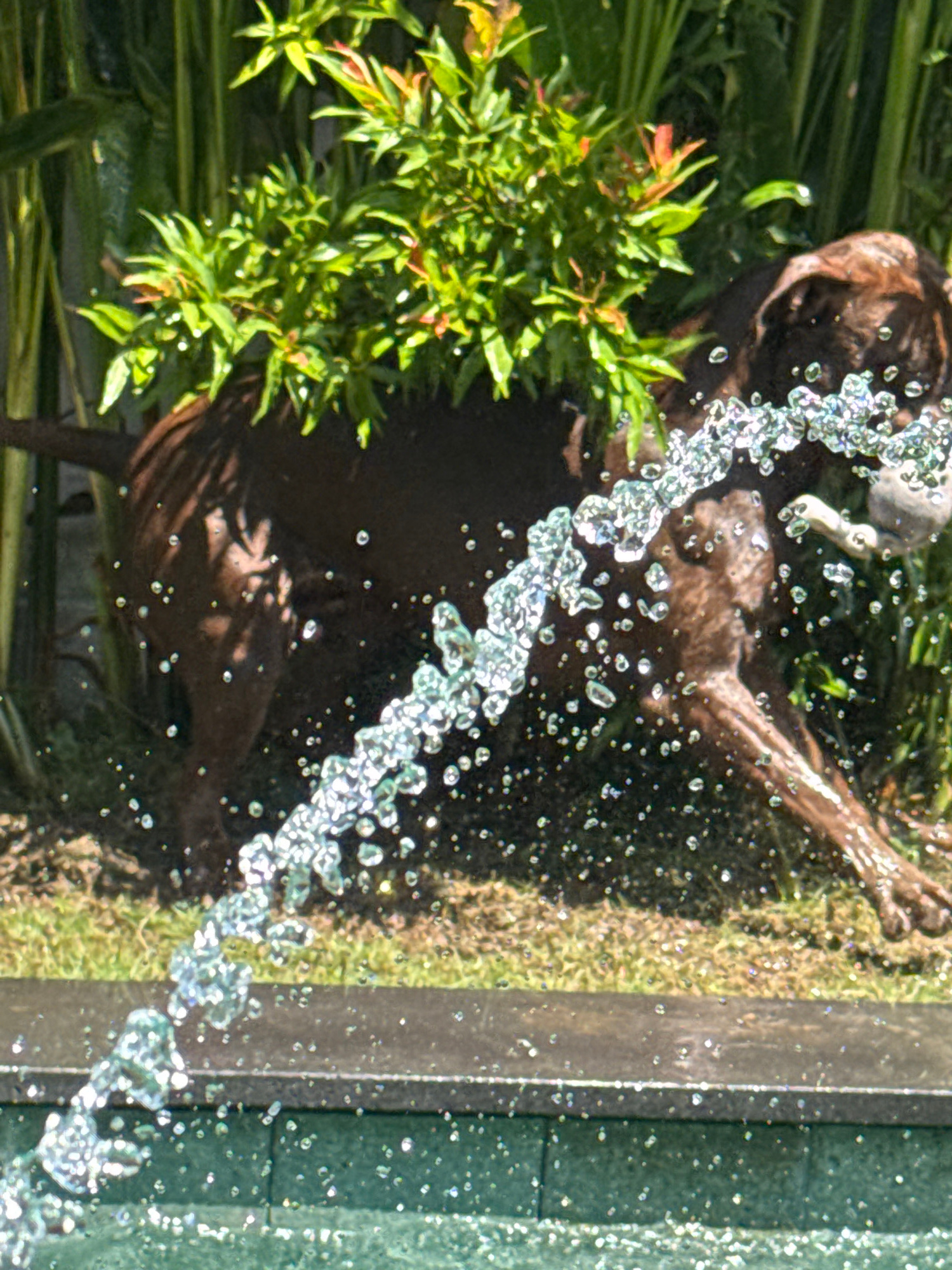 The image, taken in Cemagi, Indonesia, shows a bronze-colored, life-sized statue of a dog being sprayed with water. The statue is positioned near a concrete edge, possibly of a pool or fountain. Green…read more