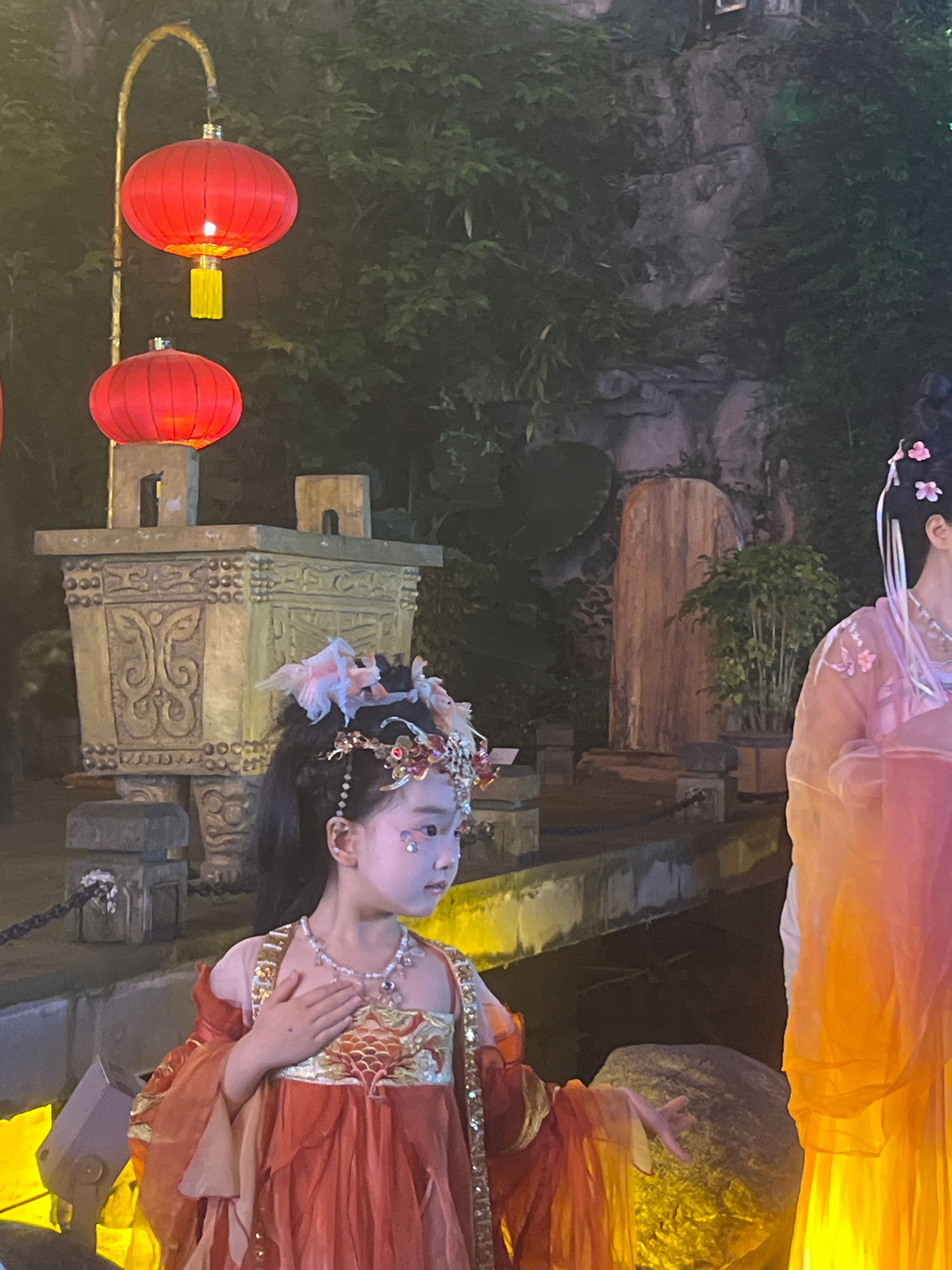 This media file depicts an outdoor evening or night scene, likely a cultural performance or display in Yuzhong District, China. Two individuals, appearing to be young women or girls, are dressed in el…read more