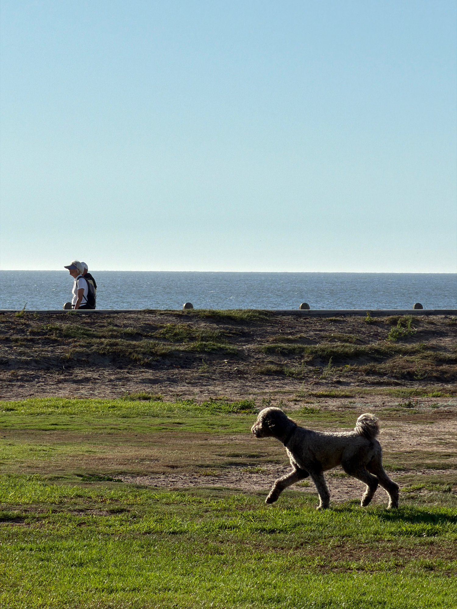 A bright, wide-angle shot captures a landscape bisected vertically into two distinct sections. On the left, a clear blue sky transitions into a calm body of water, possibly the ocean, with a person st…read more