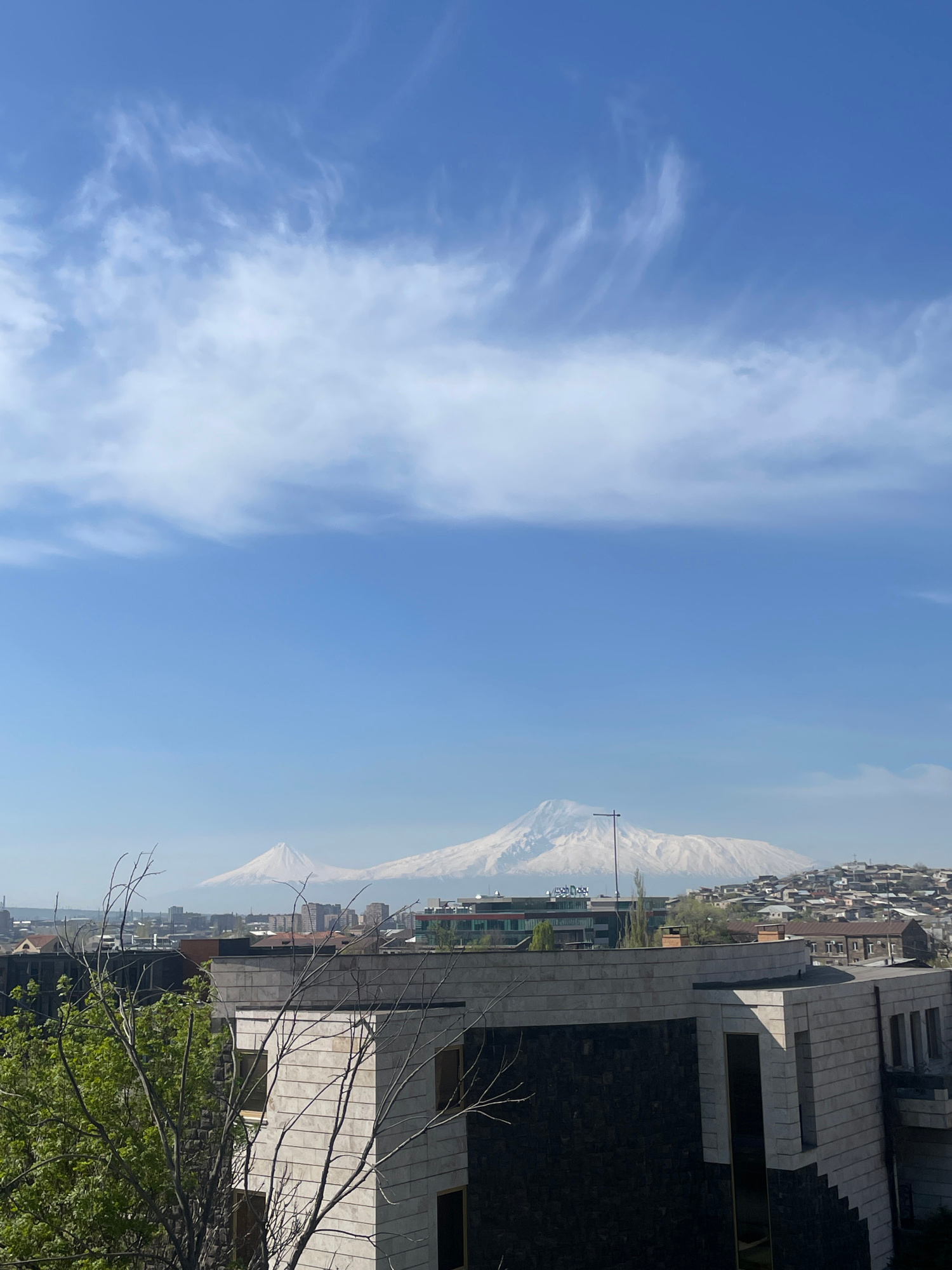 The image captures a panoramic daytime view of an urban landscape, likely Yerevan, Armenia, with the prominent snow-capped Mount Ararat in the distant background. The sky, occupying the upper half ofโฆread more