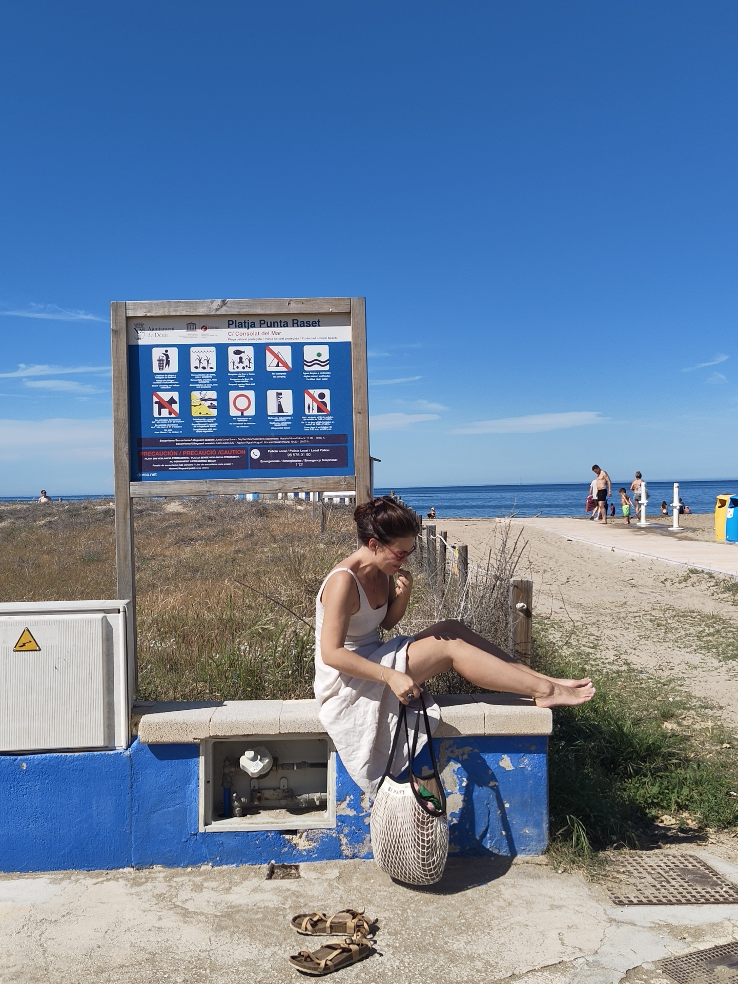 The image shows a woman sitting on a blue-and-white concrete structure near Platja Punta Raset in Dénia, Spain. She is wearing a light-colored dress and holding a mesh bag. Her sandals are on the grou…read more