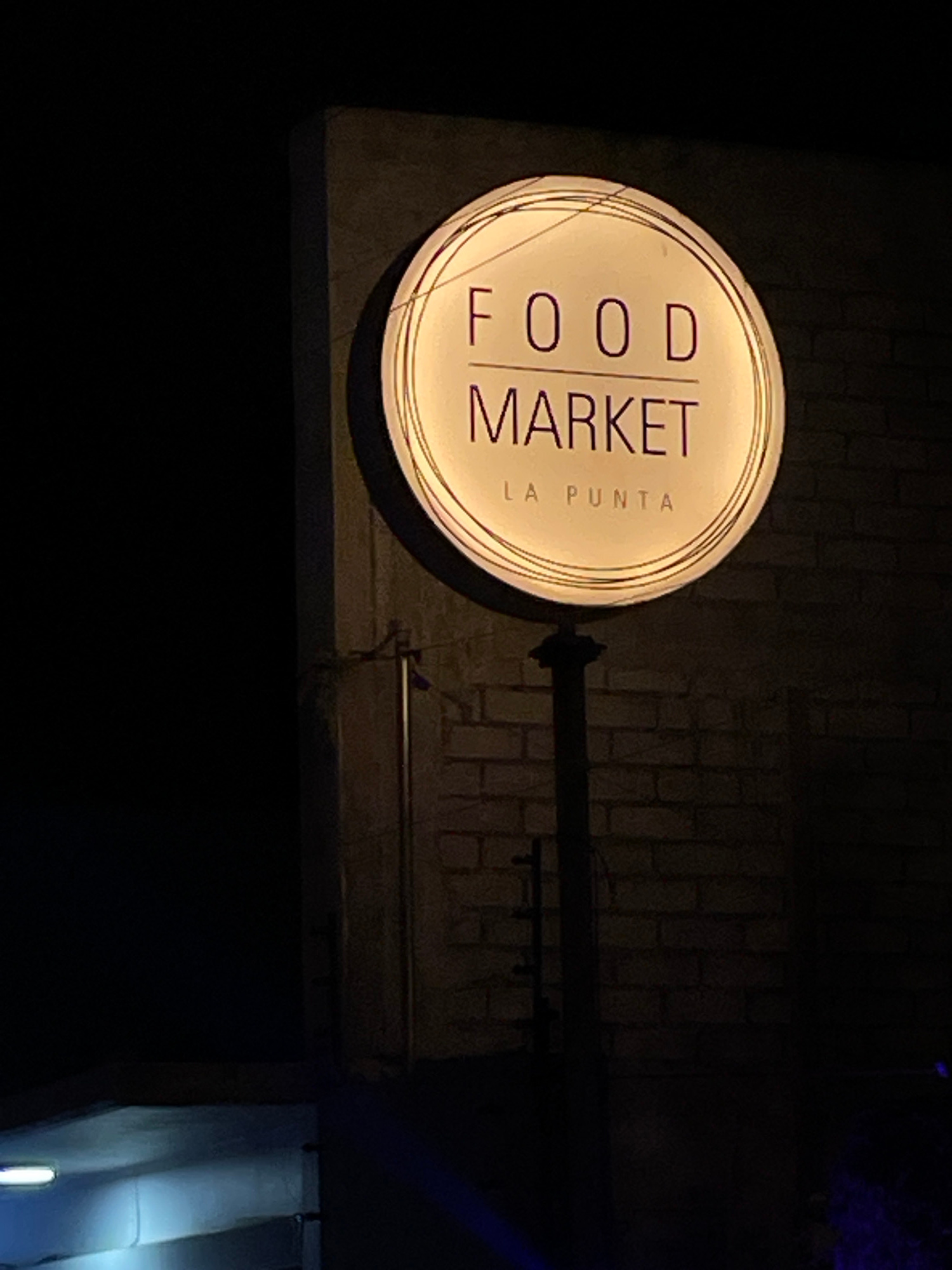 A circular illuminated sign is mounted on a concrete wall in what appears to be an outdoor setting. The sign reads "FOOD MARKET" in vertically stacked capital letters on the left, and "LA PUNTA" in sm…read more