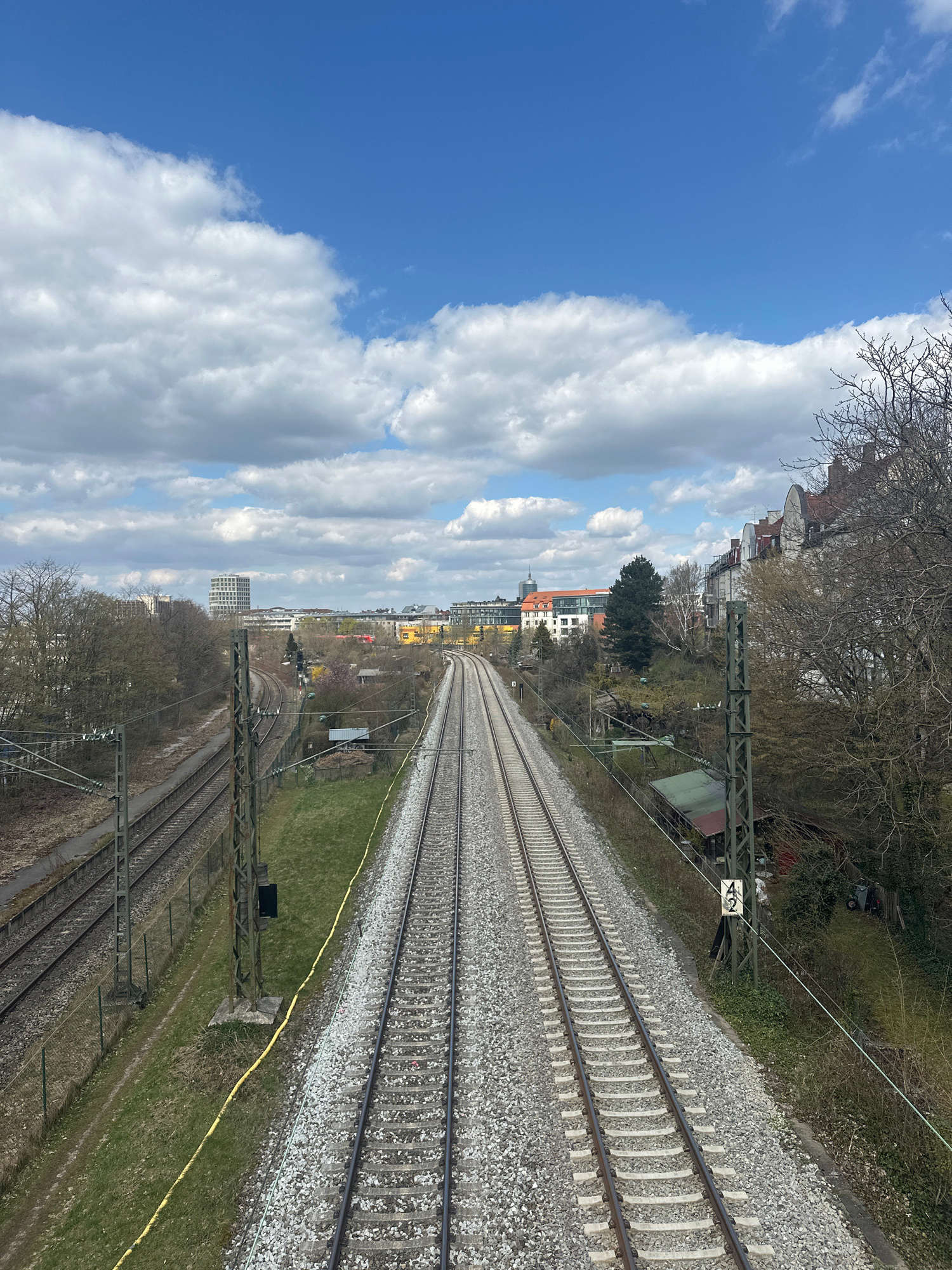 The image shows a view of railway tracks extending into the distance in Munich, Germany. The tracks are flanked by gravel and vegetation. Overhead power lines and supporting structures are visible. Bu…read more