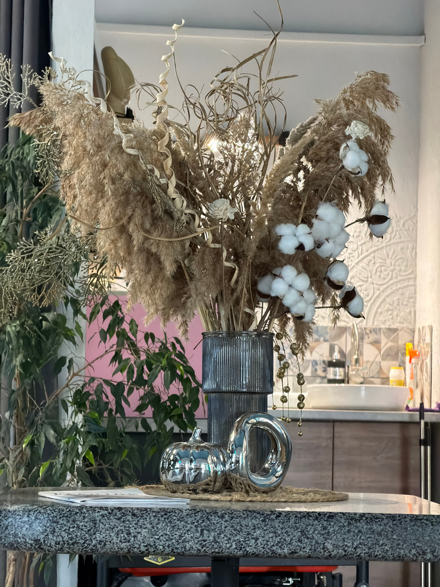 A still life arrangement is displayed indoors. The primary elements are dried grasses and cotton bolls arranged in a textured, metallic-looking vase. The dried grasses are a dominant tan color, with w…read more