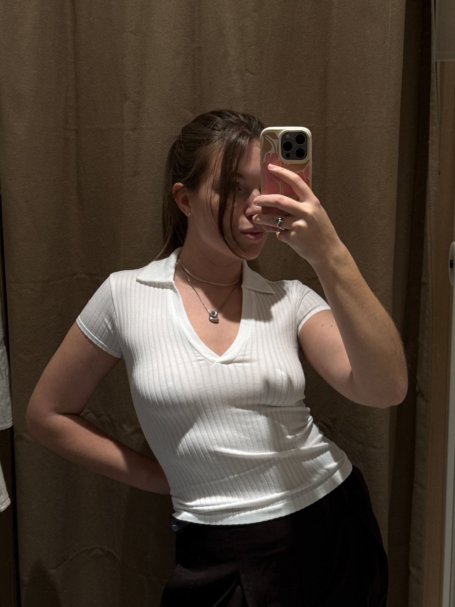 A young woman lies on a tan fabric surface, possibly a bed or couch. She wears a white ribbed top with a collar and short sleeves and a black bottom. She holds a smartphone with a decorative case in h…read more