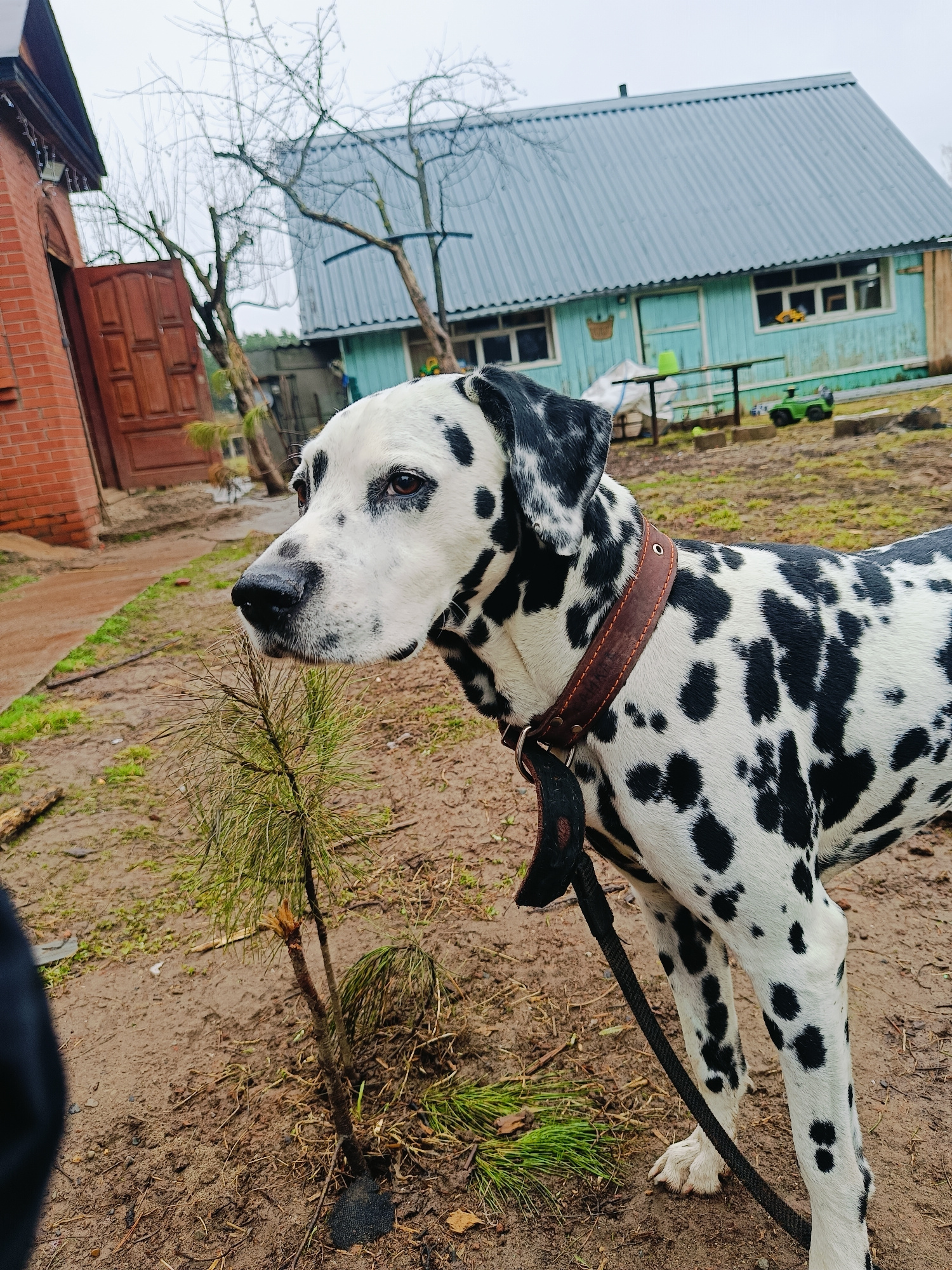 A Dalmatian dog, white with distinct black spots, stands in the foreground, looking left with an alert, neutral expression. It wears a brown leather collar with a black leash attached. The scene depi…read more