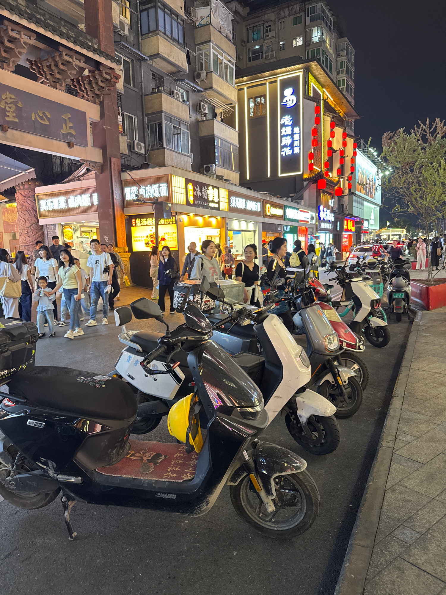 Here is a detailed description of the image: **General Scene:** The image captures a bustling night scene in Jinjiang District, China. A narrow street is lined with shops and buildings, with electric…read more