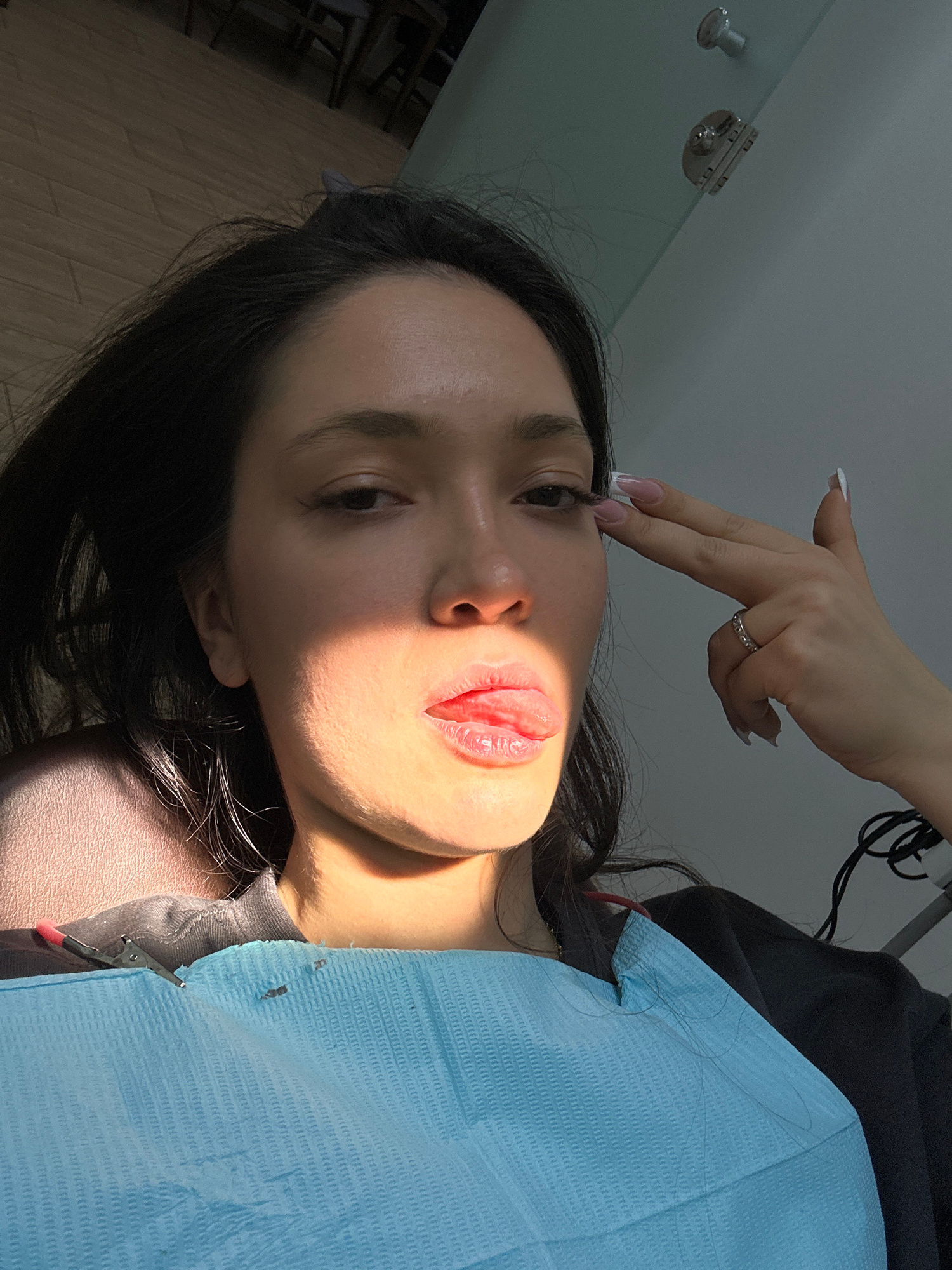 A woman lies on a dental chair, covered with a light blue bib, in a dental clinic in Yerevan, Armenia. Her dark hair is spread around her head. Another person's hand, adorned with a ring and manicured…read more