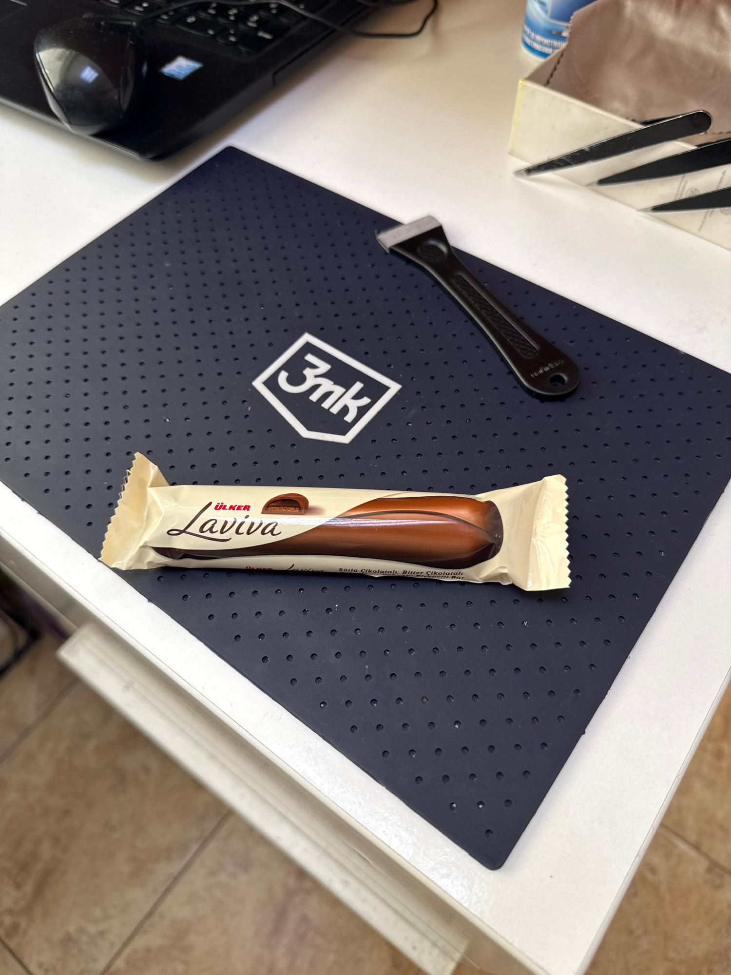 The image shows a still life scene on a white table with a dark blue rubber mat, which has a pattern of small circles. On the mat, there is a packaged Ülker Laviva chocolate bar with a white wrapper,…read more