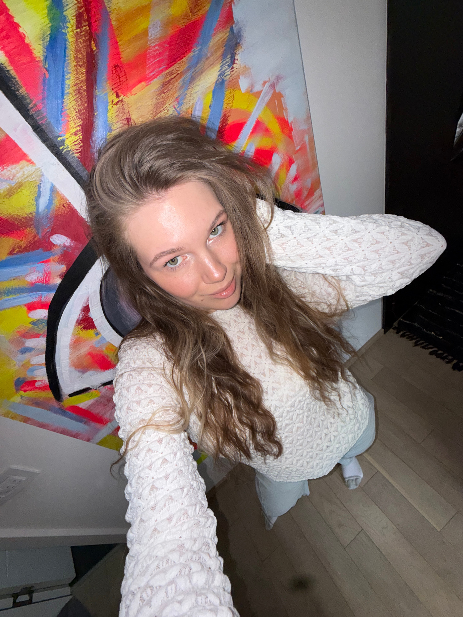 A young woman with light brown hair and green eyes is lying on her side, looking at the camera. She is wearing a white, textured long-sleeved shirt. She is lying on an abstract painting with vibrant c…read more