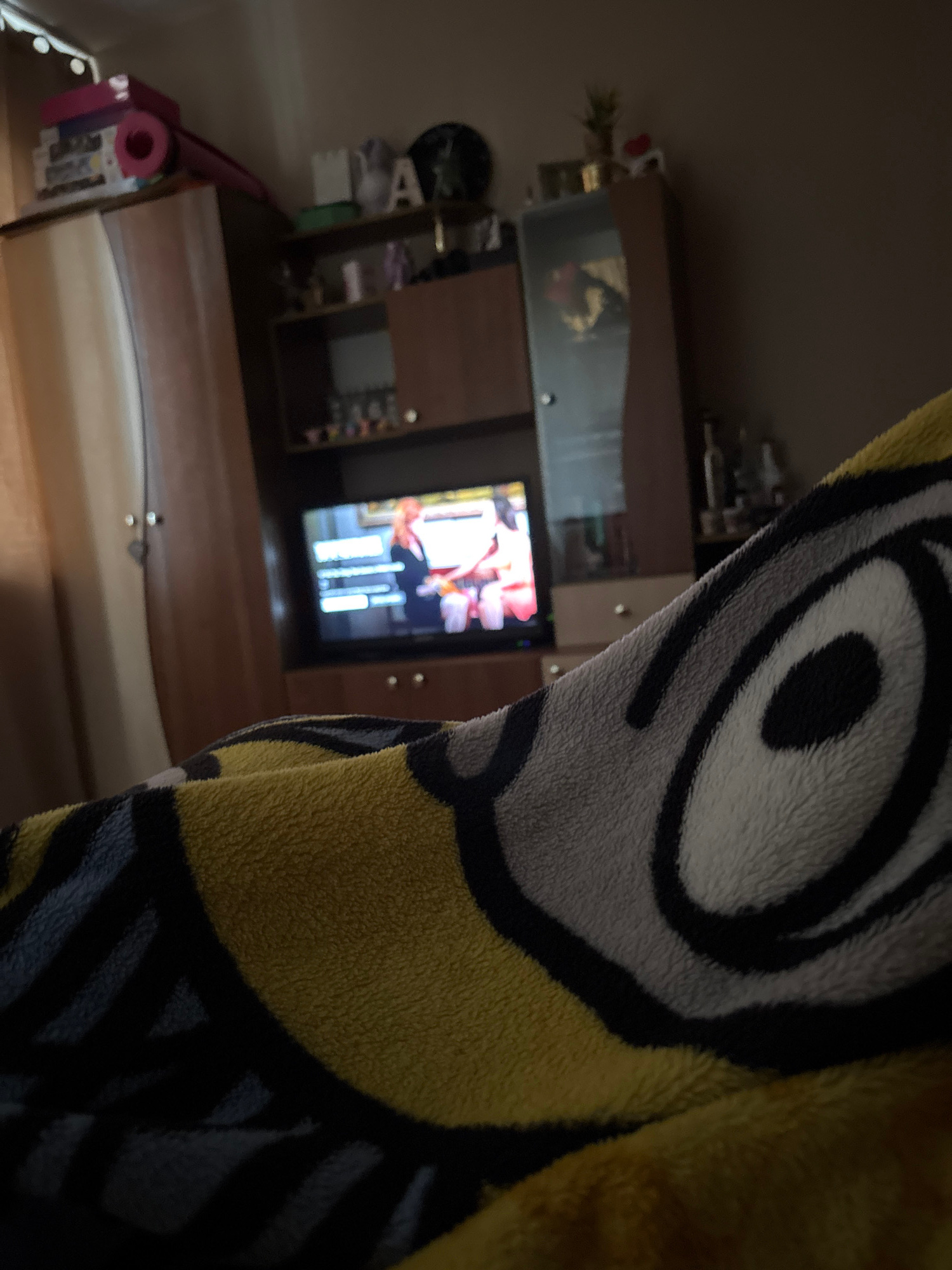 The image depicts an interior space with a television playing, partially obscured by a fuzzy blanket featuring a Minion design. The television is set within a dark-wooden entertainment unit or cabinet…read more