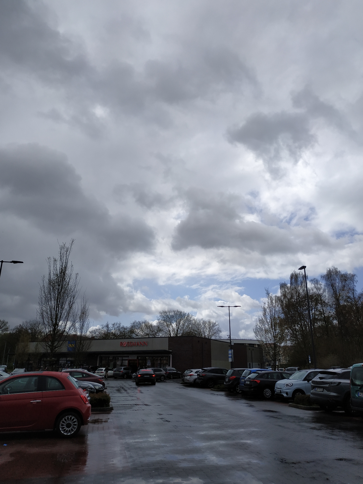 The image shows a parking lot outside a Rossmann store in Lünen, Germany on a cloudy day. Parked cars are visible, including a red Fiat 500 in the foreground. The parking lot surface is wet. Bare tree…read more