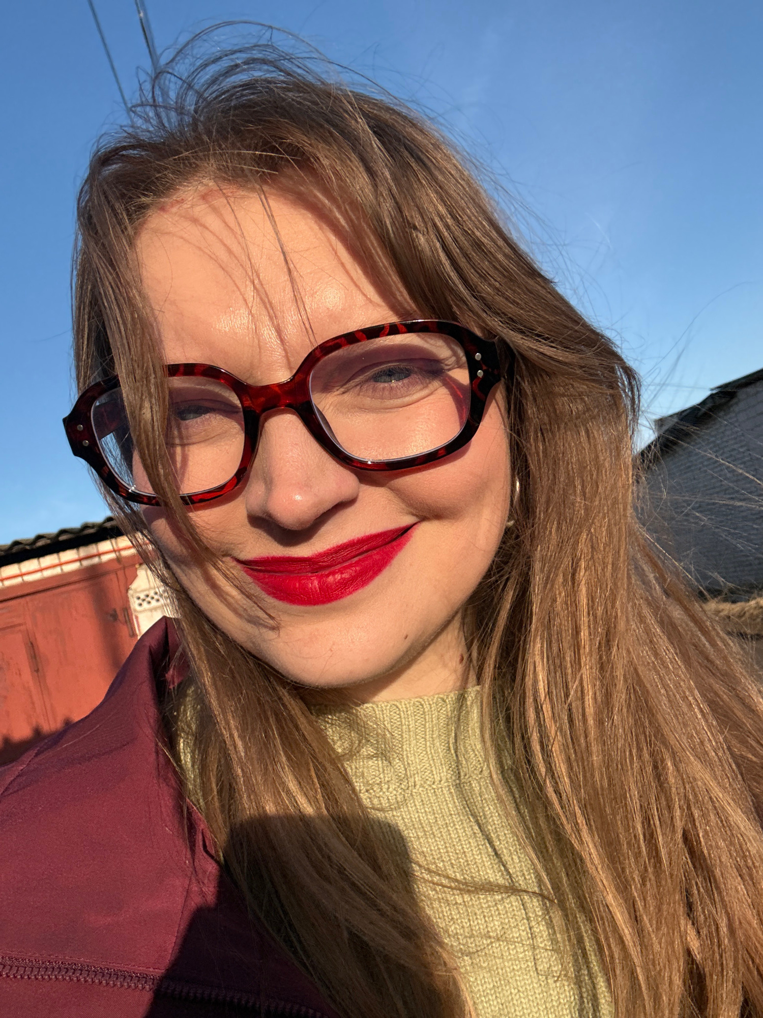 A woman with long brown hair and red lipstick is wearing red-framed glasses. She is wearing a light green sweater and a dark red jacket. The background includes a blue sky and parts of buildings, poss…read more