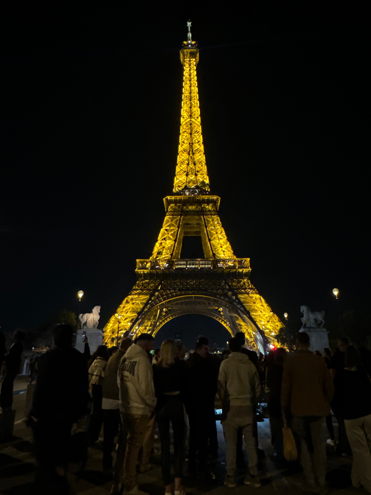 The image shows the Eiffel Tower at night, illuminated with yellow lights. A crowd of people stands near the base of the tower. Streetlights are visible. The location is Paris, France.