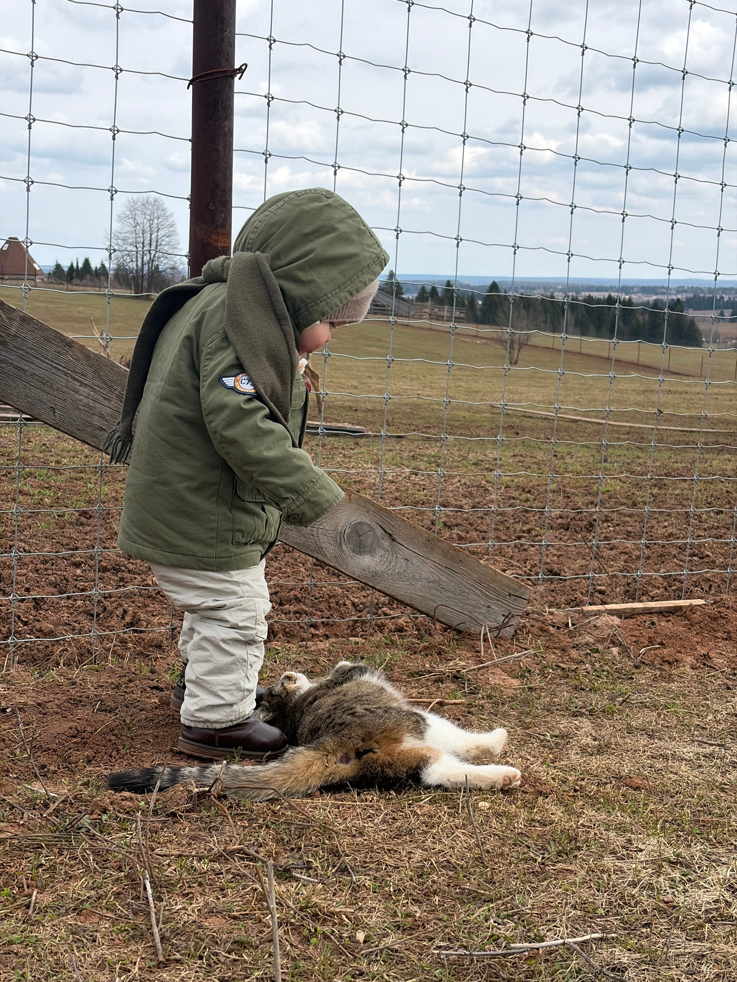 A young child stands near a wire fence, looking out into a field. The child is wearing a green hooded jacket, light-colored pants, and brown boots. A cat is lying on its back on the ground nearby. The…read more
