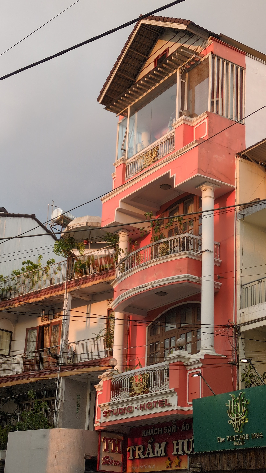This photograph depicts a building with an elaborate facade, which is identified as "Studio Hotel" and the "Vintage 1994," located on Nguyễn Văn Trỗi street in Da Lat, Vietnam. The building has a prom…read more