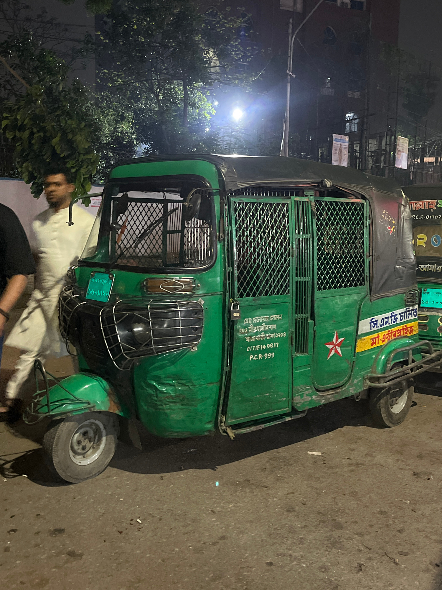 The image depicts a CNG auto-rickshaw in Dhaka, Bangladesh, illuminated by streetlights at night. The vehicle is green, with a caged passenger area. Text on the auto-rickshaw includes contact informat…read more