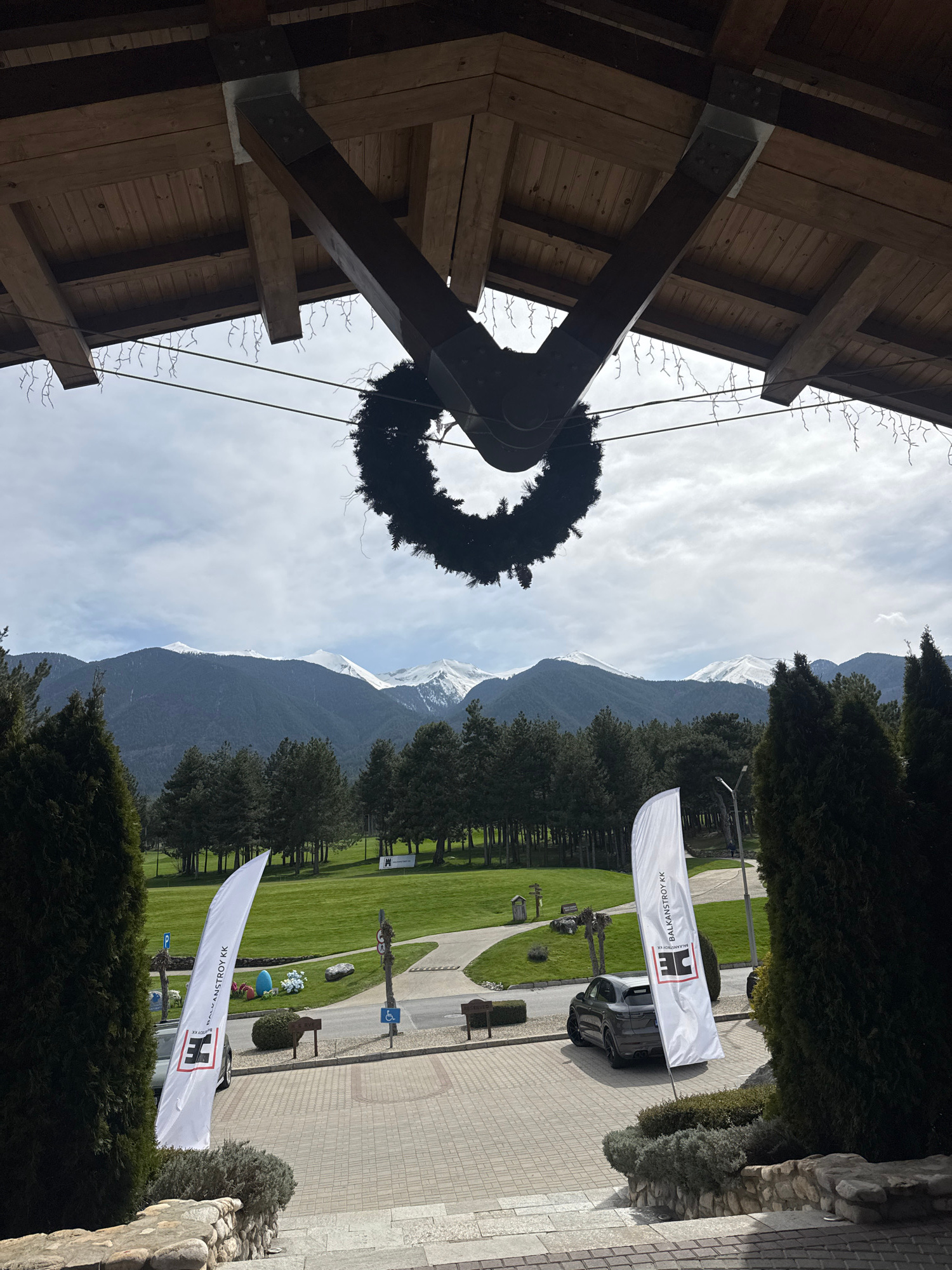 This image, oriented vertically, captures a scenic outdoor view, likely taken from beneath a large wooden structure. In the immediate foreground, the underside of a robust wooden roof or overhang is v…read more