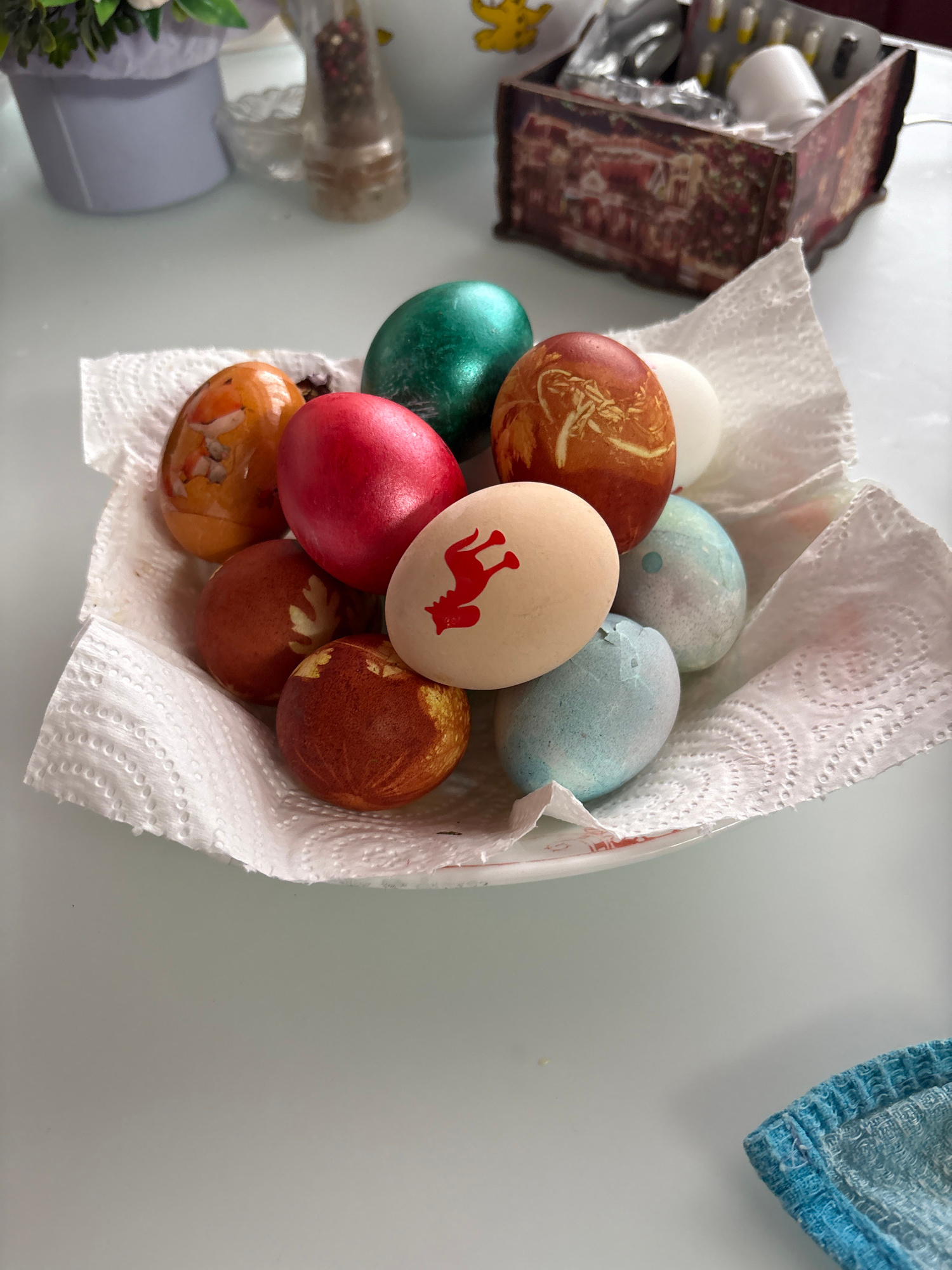 The image shows a collection of Easter eggs in a white bowl lined with paper towels. The eggs are dyed in various colors: red, green, blue, brown, and white with a red silhouette of a rabbit. The background is a white surface with additional objects including pills, spices, artificial plants, and a blue towel. The location of the image is not discernible from the visual information provided. Therefore, including information about the location in the city of Simferopol, Ukraine, is not possible. | Open Wire