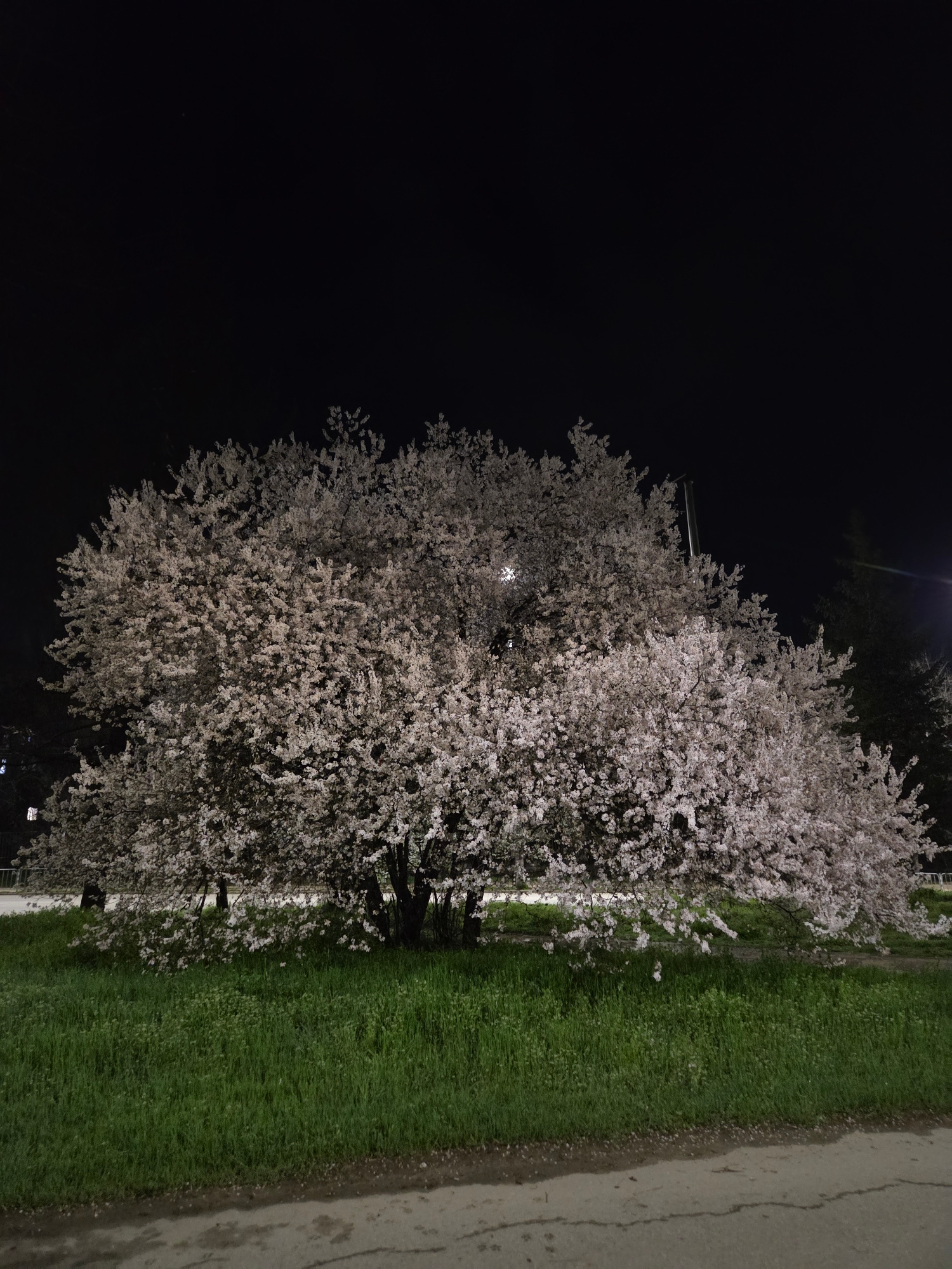 A nighttime scene depicts a blooming tree along a road in Pleven, Bulgaria. The tree, densely covered in light-colored blossoms, stands adjacent to a grassy verge between the road and a dark, unlit ar…read more