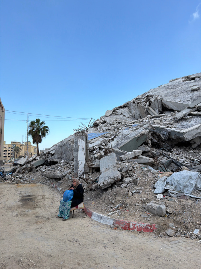 A collapsed building stands in ruins against a blue sky, its concrete remains sprawled across the ground. A palm tree is partially visible near the debris. An elderly woman, wearing a headscarf and ca…read more